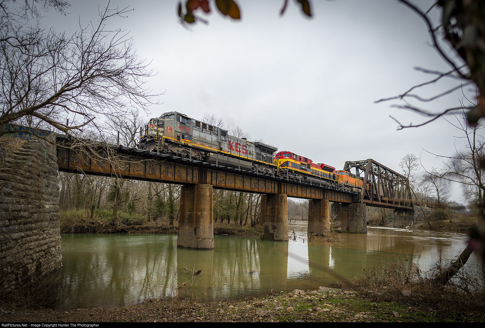 | Three locomotives push on the rear of a southbound coal train as it passes over the Illinois River just north of Watts, OK on a cloudy December 19, 2021 morning. |