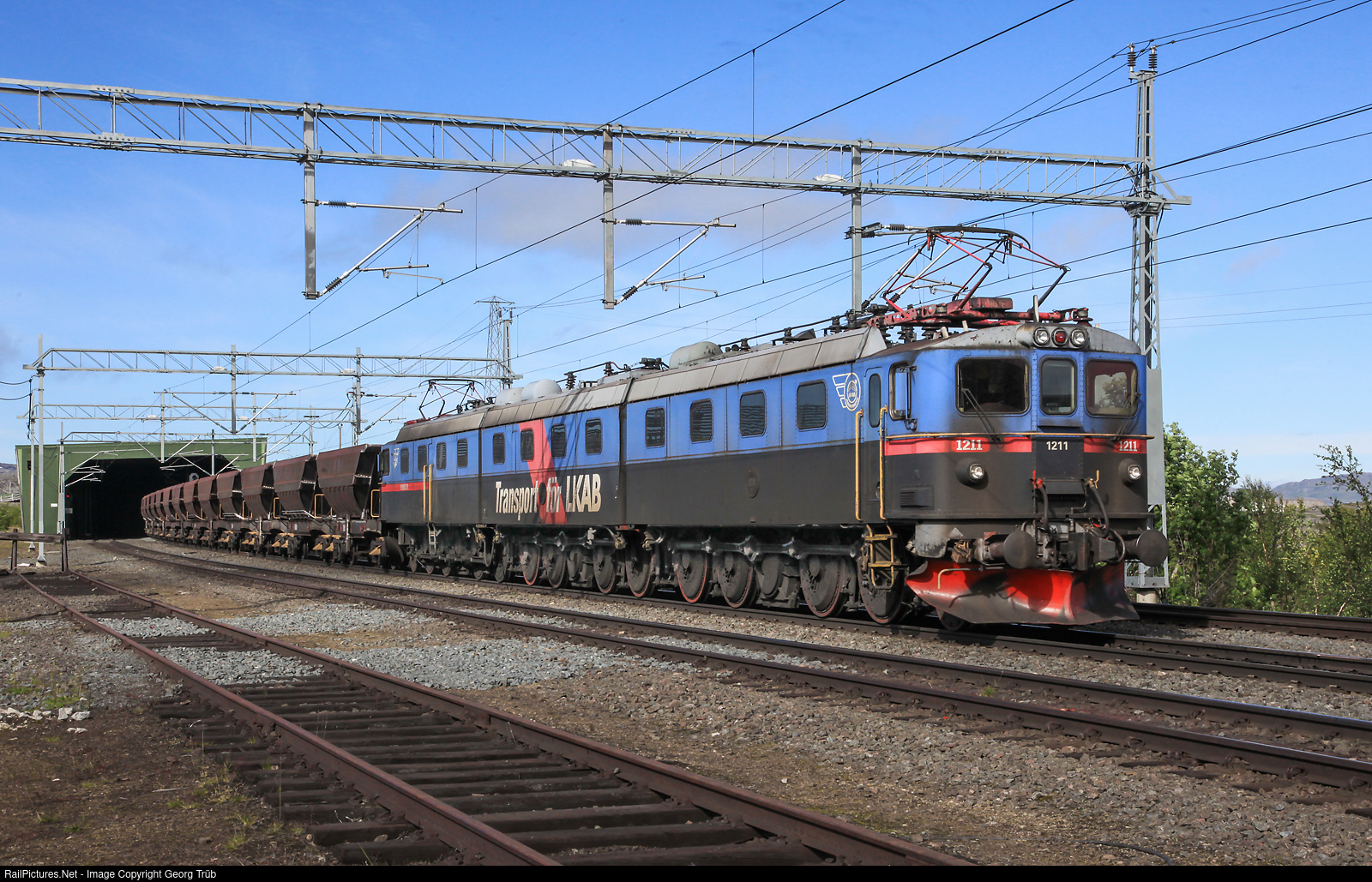 | Dm3 # 1211-1236-1212 "Konsuln" with an empty 52 cars ore train from Narvik to Kiruna is leaving the snow shed and entering Bjørnfjell station. |
