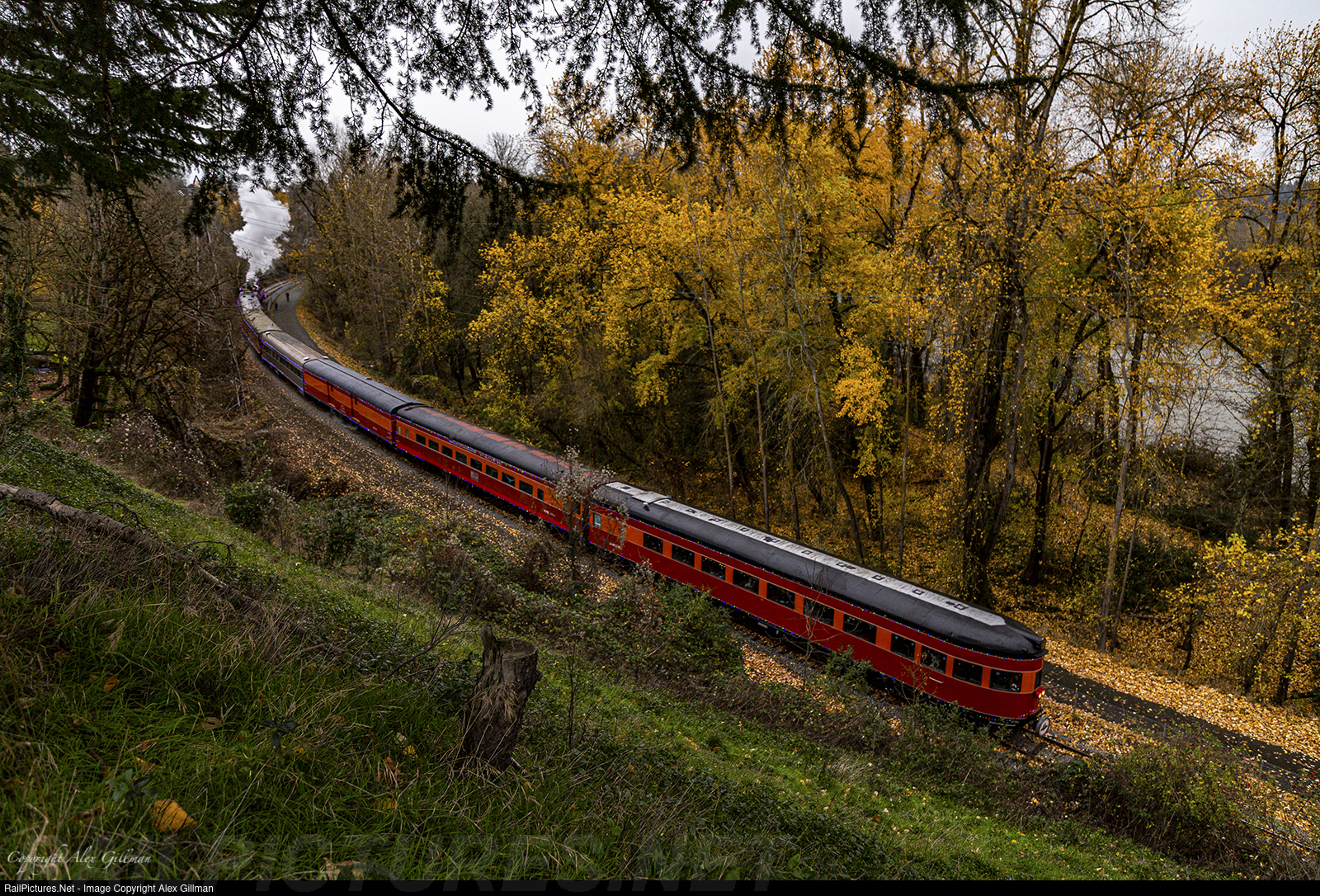 | The beautiful, rear-end observation car DLMX 2955 is seen on the point of the shove of this edition of the Holiday Express as SP 4449 shoves the train along the Willamette River and a string of stunning, yellow-leafed trees. |
