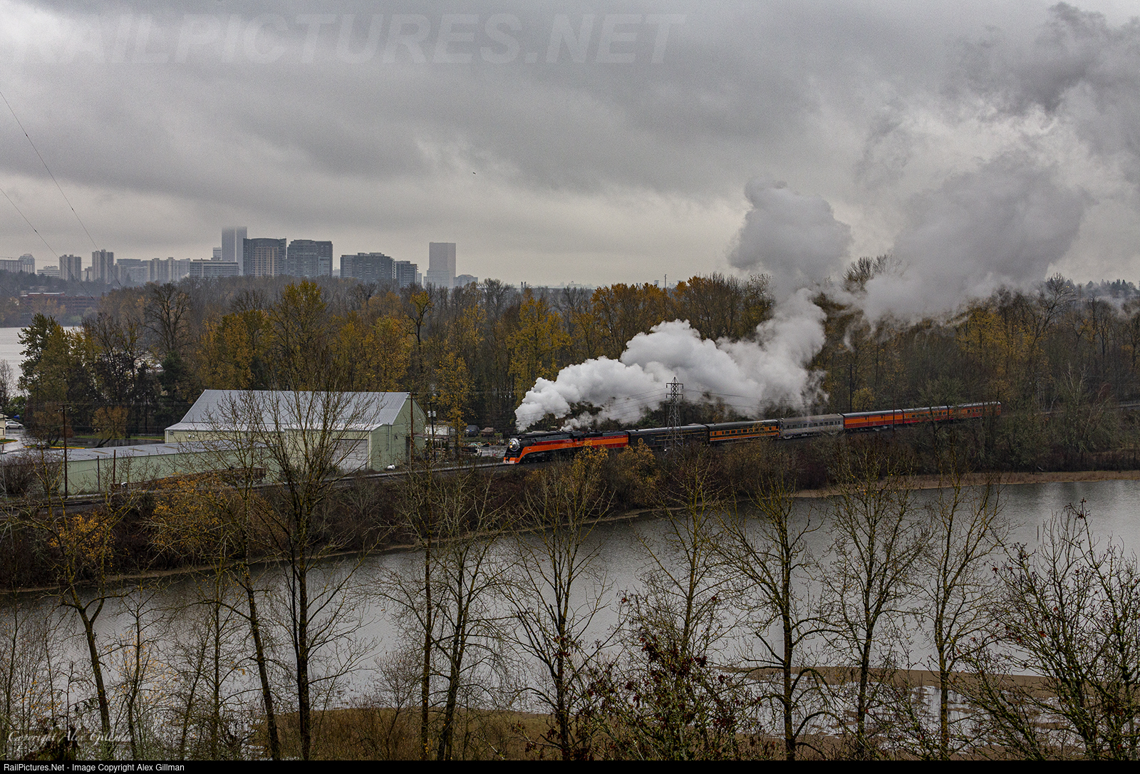 | A stark contrast from the coast line of Southern California where it once lead the famous Daylight passenger train, SP 4449 finds itself on the point of this afternoon's Holiday Express on a rainy day in Portland, Oregon. |