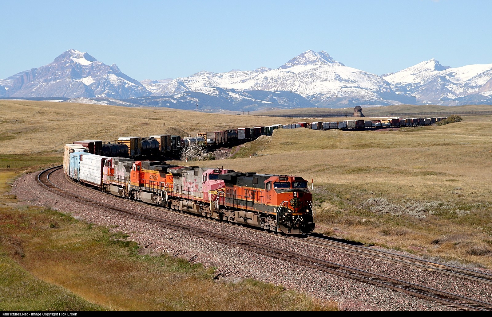 Coiling down the long grade from the high country to the plains, BNSF 1046, in the company of a couple of faded ladies, presents a fine late summer view in the northern Rockies. That Heritage I scheme fit nicely with the ex-GN lines while the warbonnet colors seemed like fish out of water in this territory.