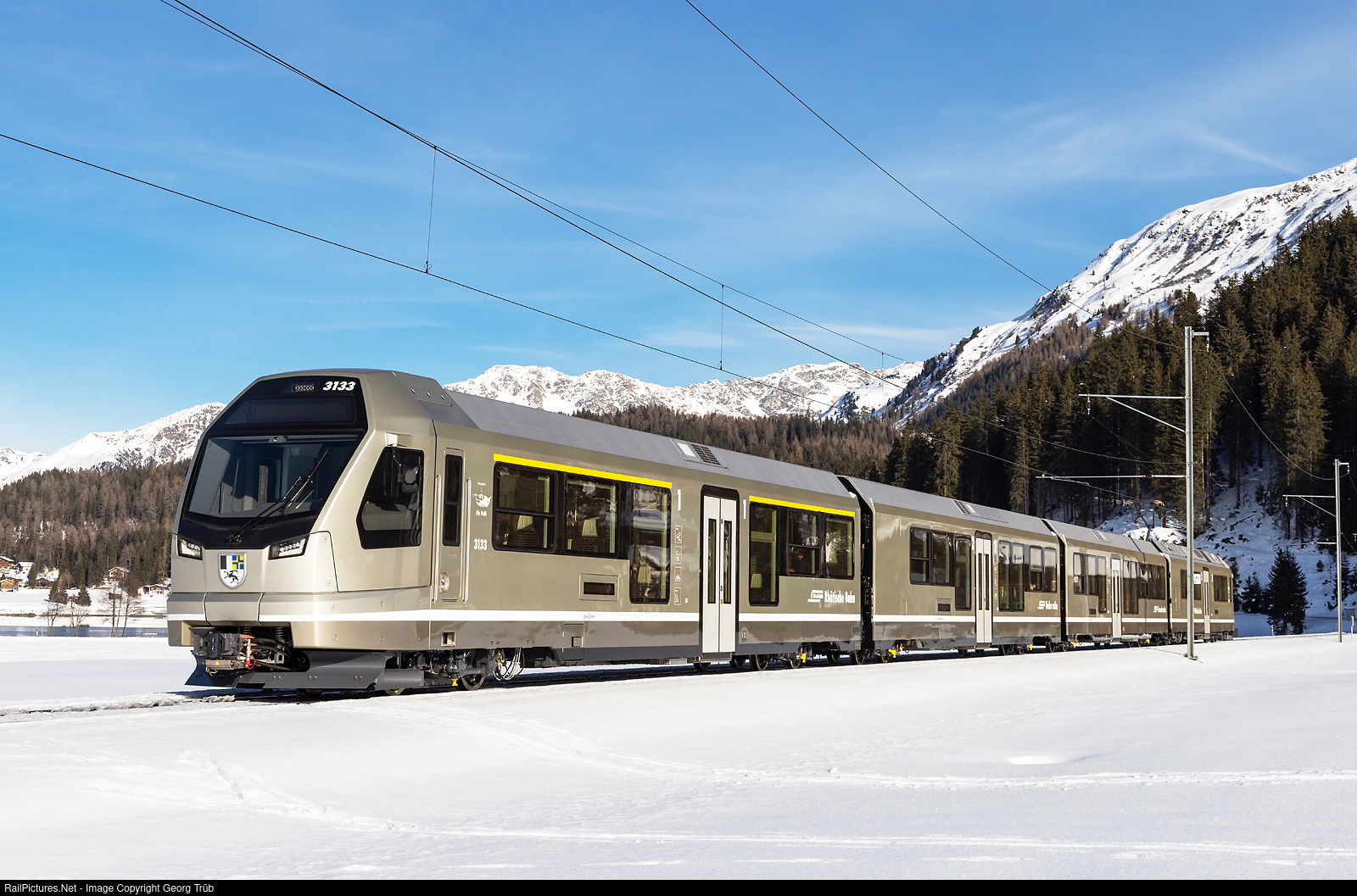 "Capricorn" ABe 4/16 # 3133 "Piz Palü" of the Rhaetian Railway in "champagne" color runs as RE 1839 from Klosters Platz to Davos Platz, near Davos Dorf. The 500th passenger car body from the Altenrhein plant for the RhB since 1960 was installed in this train (car D). FFA (Flug- und Fahrzeugwerke Altenrhein) in Altenrhein built standard cars type I, II and III, later from the same factory from SWA (Schindler Waggon Altenrhein) standard cars type IV, then from StadlerRail Allegra multiple units, ALVRA compositions and now 56 "Capricorn" trains.