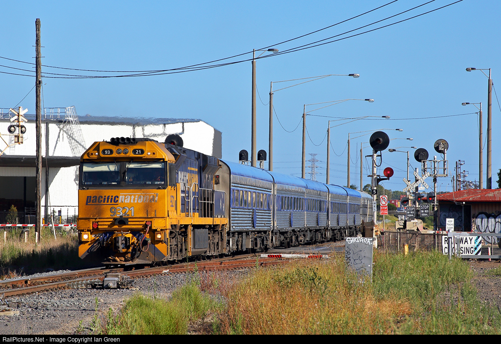 | Replacing the more common NR class loco, 9321 hauling 5AM8 Overland service from Adelaide to Melbourne passes through Brooklyn. |