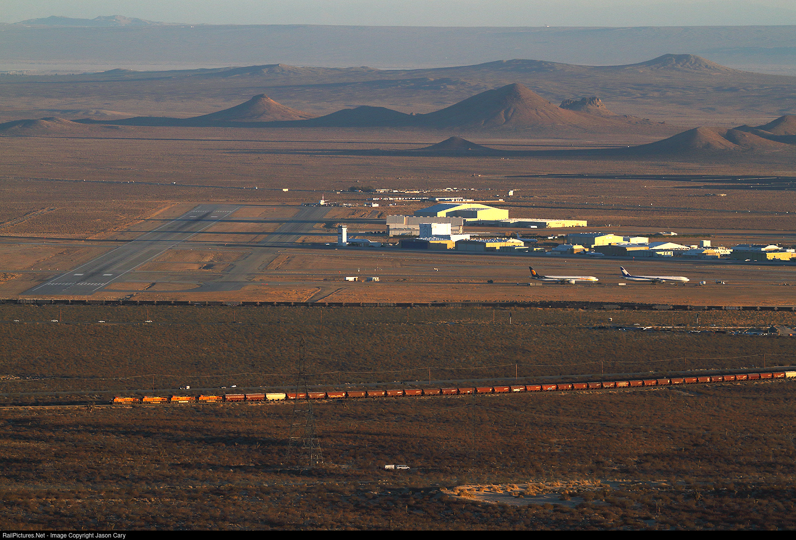 A Grain Train charges the 2%+ grade approaching Warren on the east slope of Tehachapi Pass. Above the grain train is a empty coal train that has just returned from Trona. The coal train sits on the border of the Mojave Airport. Two 777s sit in storage, with the one on the far right awaiting engine replacements. At the end of the runway sits a former Virgin Atlantic 747-400. Richard Branson has transferred it to his Virgin Galactic Space Program. The dark line above the airport is BNSF's Mojave Subdivision.