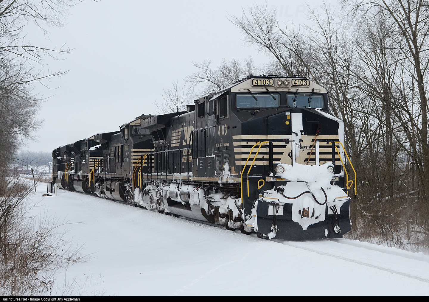 With the last two trainloads of synthetic gypsum for the season delivered to the USG Washingtonville Plant, a lite power move of all engines is heading west for them to be placed into service elsewhere. The first two engines, NS 7704 & 7339, were at the plant in a significant snowstorm. The trailing two, NS 9843 & 4103, with the final train, arrived at the plant after the storm. NS 4103 AC44C6M, the lead unit to the plant, and now the trailing unit going west, is sporting a nice underframe snow pack.