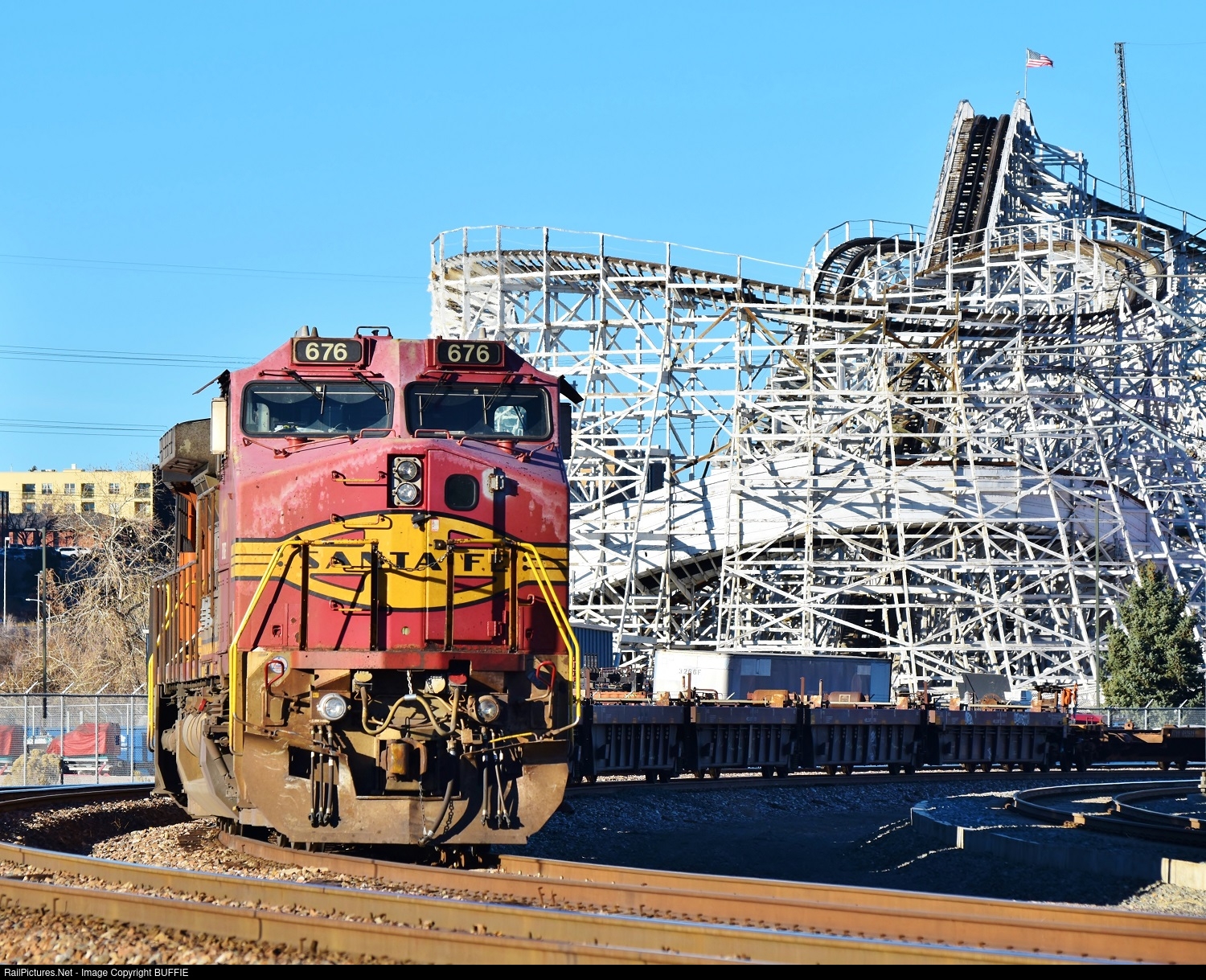 BNSF Warbonnet 676 (Dash9) sits by the Elitch Gardens roller coaster in downtown Denver, Colorado.