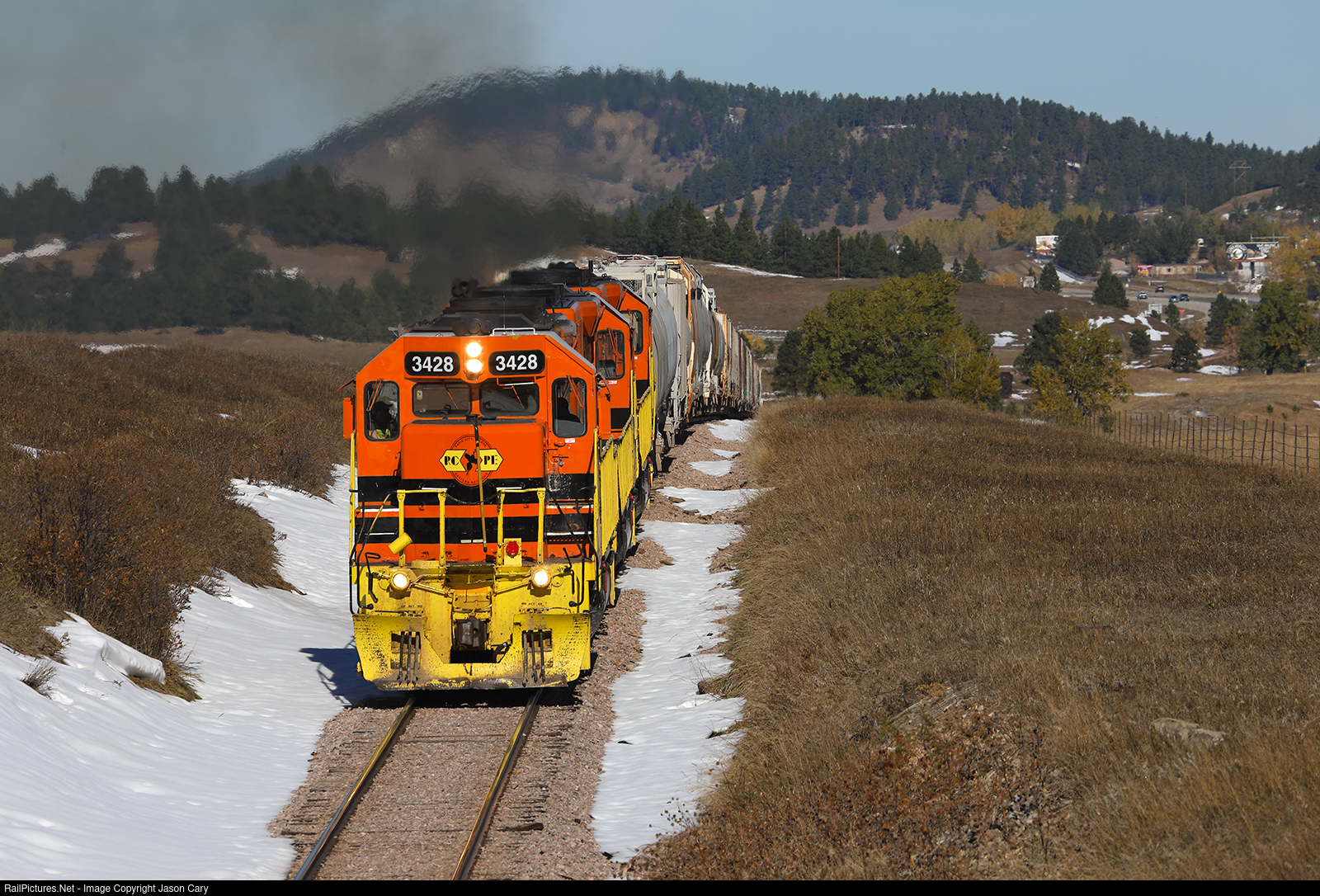 RCPE has just crested another Hill along the ex Chicago & North Western line to Belle Fourche. The train is heavy with bentonite clay which is used in oil drilling and various other industrial uses. The long train is about to pass thru the I-25 "Tunnel" near Tilford.
