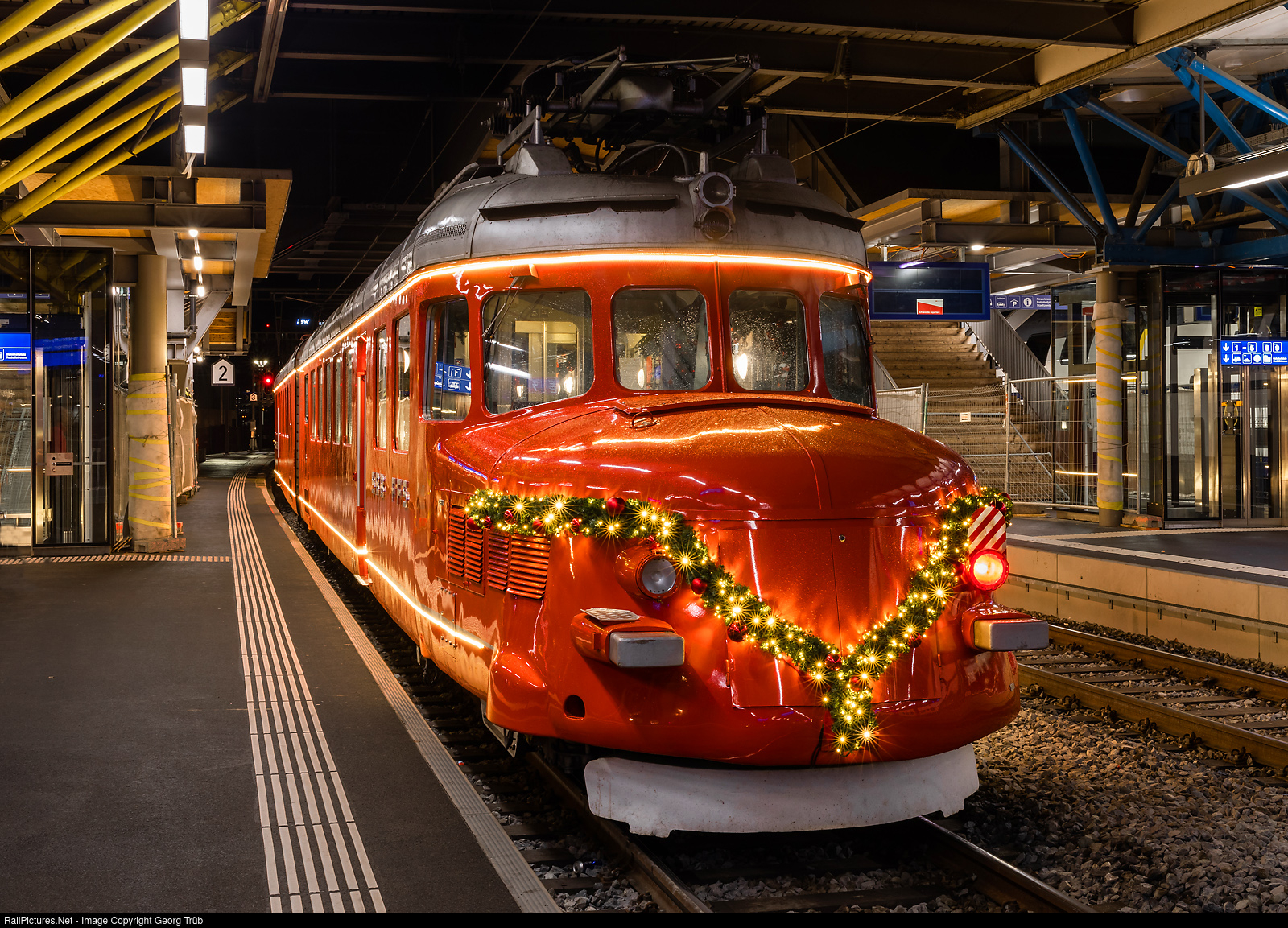 SBB's red double arrow "Churchill-Pfeil" RAe 4/8 # 1021 is on a Christmas Eve round trip from Zurich via Killwangen-Würenlos-Regensdorf-Kloten-Winterthur-Andelfingen-Schaffhausen-Etzwilen-Ossingen-Winterthur-Wallisellen to Zurich HB. The elegant vehicle, built in 1939, is decorated for Advent and Christmas, on the one hand with an LED strip on the edge of the roof and in the lower box area, and on the other hand on the front with a fir branch-Christmas tree ball-candle motif. The "Churchill-Pfeil", which name comes from former british prime minister Sir Winston Churchill, which travelled in it during his visit in Switzerland in 1946, is ready for departure in Winterthur.