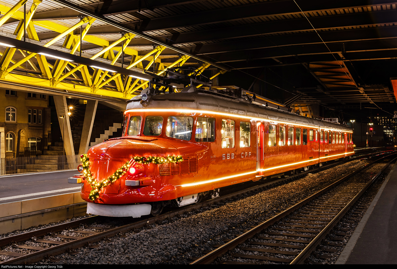 SBB's red double arrow "Churchill-Pfeil" RAe 4/8 # 1021 is on a Christmas Eve round trip from Zurich via Killwangen-Würenlos-Regensdorf-Kloten-Winterthur-Andelfingen-Schaffhausen-Etzwilen-Ossingen-Winterthur-Wallisellen to Zurich HB. The elegant vehicle, built in 1939, is decorated for Advent and Christmas, on the one hand with an LED strip on the edge of the roof and in the lower box area, and on the other hand on the front with a fir branch-Christmas tree ball-candle motif. The "Churchill-Pfeil", which name comes from former british prime minister Sir Winston Churchill, which travelled in it during his visit in Switzerland in 1946, is ready for departure in Winterthur.