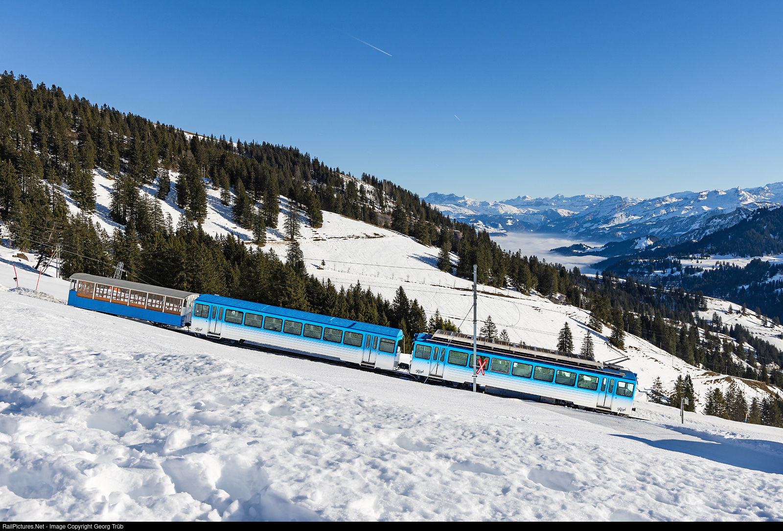 "Sport-Pendel" (push-pull train for sportsmen, sledgers, skiers, hikers etc.) of the Rigi Bahnen is running from Rigi Kulm down to Rigi Klösterli. Cogwheel railcar BDhe 4/4 # 15 with cab car Bt # 25 and car B # 34 (built in 1875!) below Rigi Staffel, in the background from left Bös Fulen, Höch Turm and Ortstock.