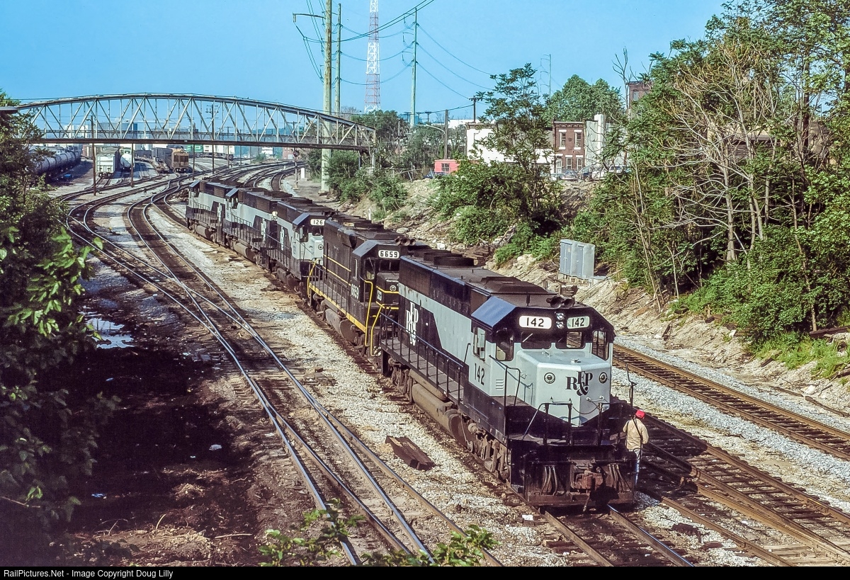 The southbound Orange Blossom Special has arrived in Philadelphia from Kearny, New Jersey. The Conrail crew has left the train at Grays Ferry, and is proceeding away from the photographer and toward CSX’ East Side Yard office which can be seen under the r1ght end of the footbridge.