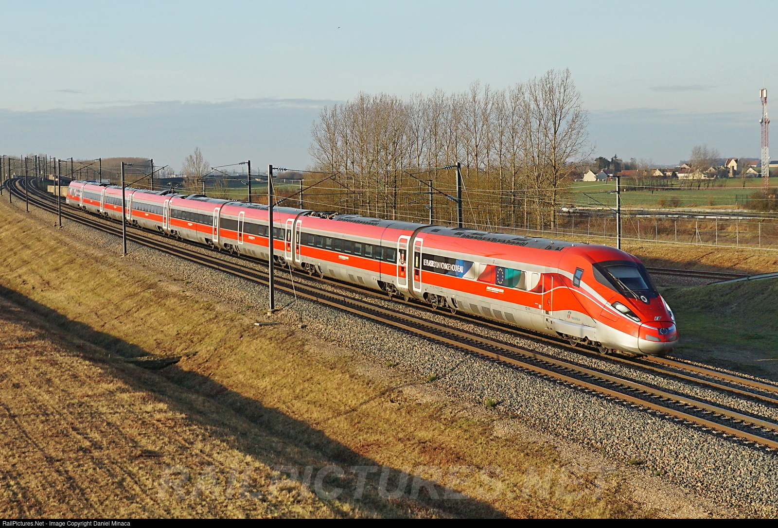 | Special painting that said (the pleasure of a new trip) with French, European and Italian flags for this Zefiro High speed trains (also named Frecciarossa=Red Arrow) from Italian Thello company which now running on French high speed line #1, it is one of the first commercial trip at 300 Kp/H in real conditions. 2 trains per day are circulating from Paris Gare de Lyon to Mliano Italian City with stops at Lyon and Torino. Open traffic is now allowed in France and that mean that others companies like national SNCF can now operate for national or international traffics. |