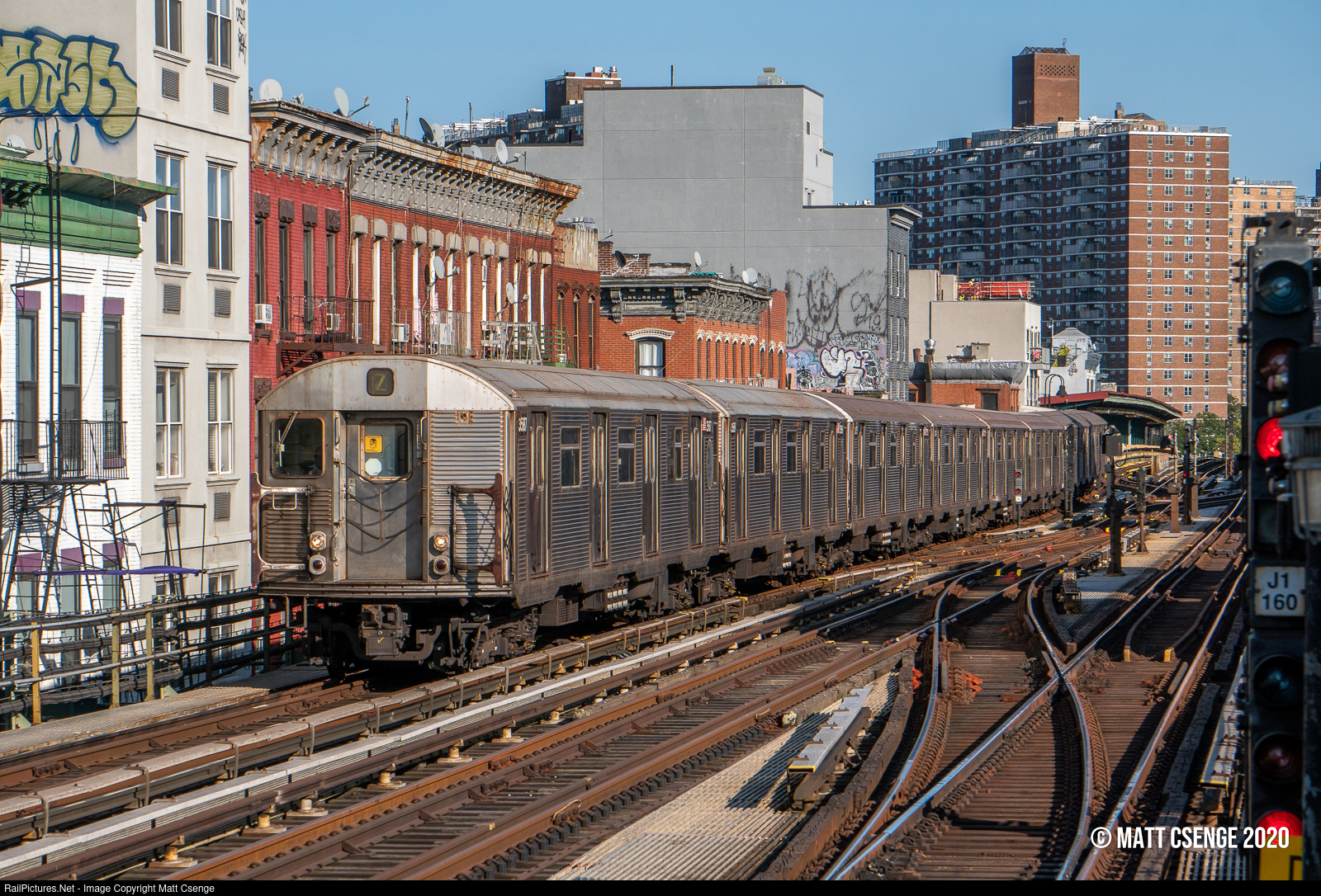 A Manhattan-bound Z train of R32 "Brightliners" approaches Marcy Ave. Upon hearing of the R32s reactivation in summer 2020, this was one of the places I definitely wanted to catch them. This part of Williamsburg is so built up that it gives me an idea of what the Manhattan Els must have been like. Few other elevated parts of the subway compare, most have lower houses or apartment buildings around them (I'm looking at you, West End Line), which make them less interesting in this way.