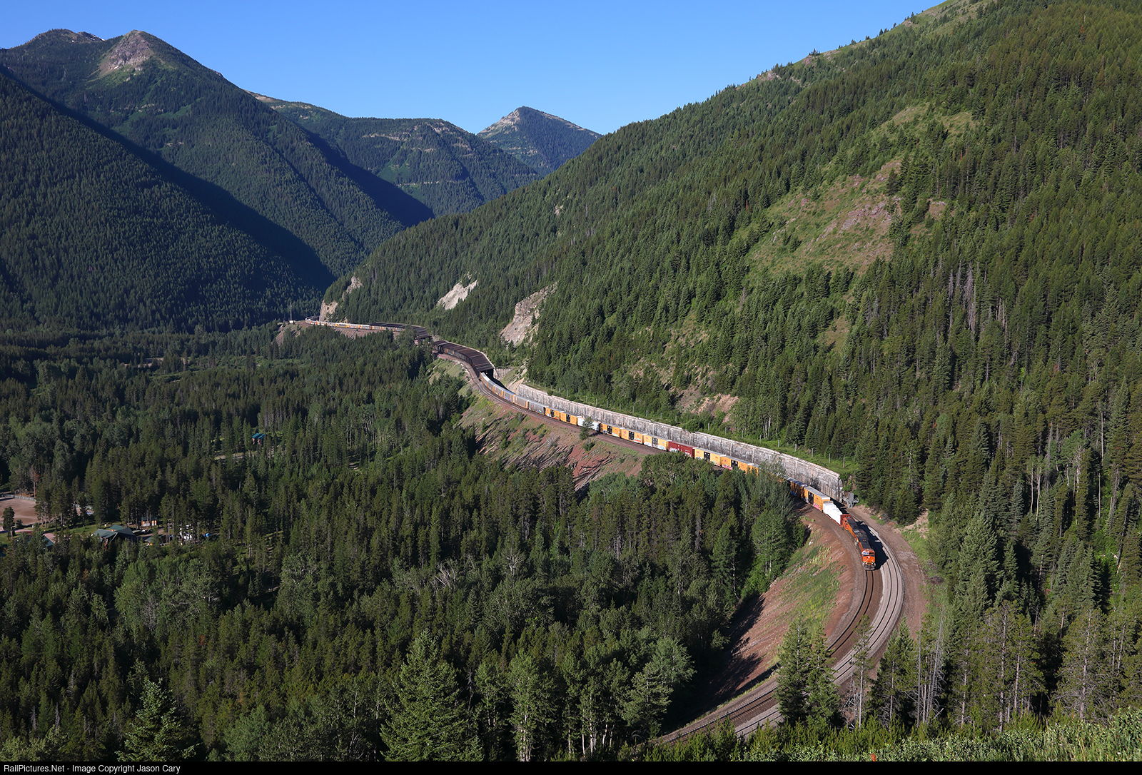 A eastbound manifest climbs the heavy grade (1.8%) at Java, Montana. A dry cold front moved in making for a crystal clear morning despite fires in the area. The snow sheds protect the mainline from a slide area, This location is well known for large Grizzly Bears, so hiking the hillsides full of berries keeps you alert....