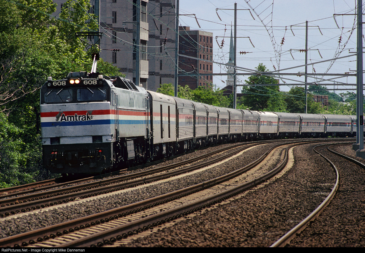 A northbound Amtrak train powered by GE E60MA No. 608 rolls through the curves at Elizabeth, New Jersey on May 21, 1993. There were so many trains that afternoon, that I don’t recall which one this was.