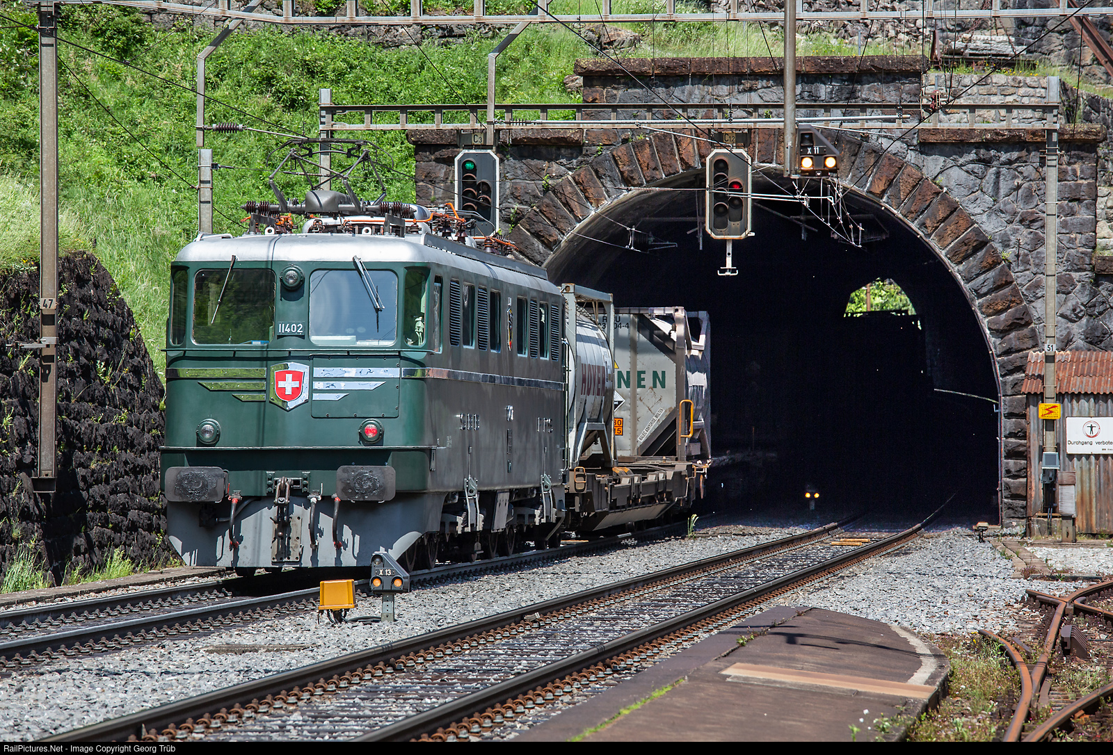 Classic Gotthard locomotive Ae 6/6 # 11402 "Uri" of SBB Historic, built in 1953 by SLM/BBC/MFO and based in Erstfeld, is shoving the heavy HUPAC intermodal train 43075 from Duisburg Ruhrort Hafen/Germany to Gallarate (Busto Arsizio Terminal)/Italy, on the Gotthard north ramp from Erstfeld to Göschenen, running through Wassen and entering the middle Entschigtal avalanche protection gallery. This performance was made on the order of interested railroad enthusiasts.