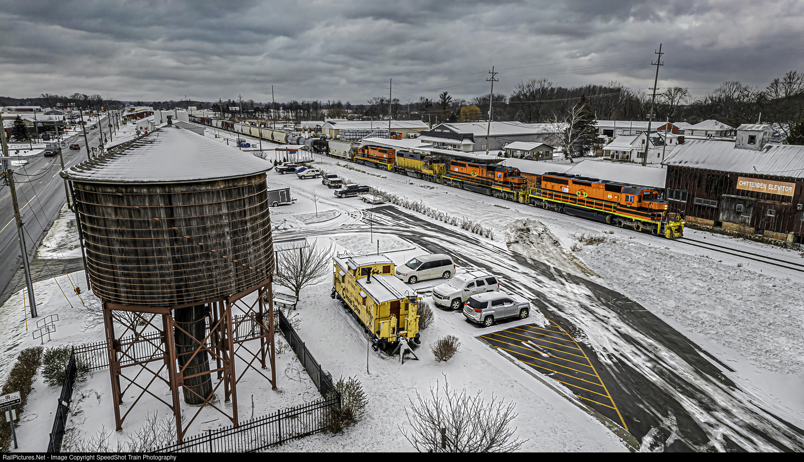 | Z151 Marquette Rail rolls Northbound through Grant Michigan on a snowy Thursday afternoon with the old Chessie System caboose and old water tower in the foreground |