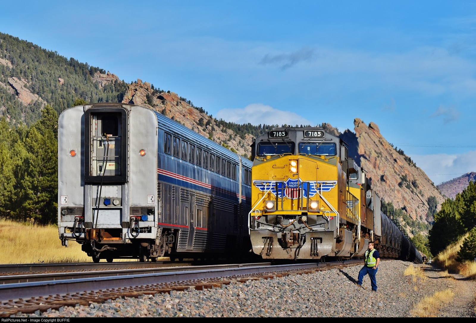 A crew member of UP 7185 (AC4400CW) finishes the roll-by inspection of the California Zephyr and will soon continue down the Moffat Tunnel Sub towards Denver, Colorado.