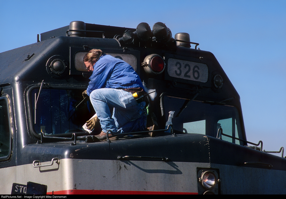 An Amtrak employee in Denver, Colorado, cleans the windshields of the lead EMD F40PH No. 326 on the westbound California Zephyr during the extended servicing stop at Denver Union Station on the morning of March 2, 1993.