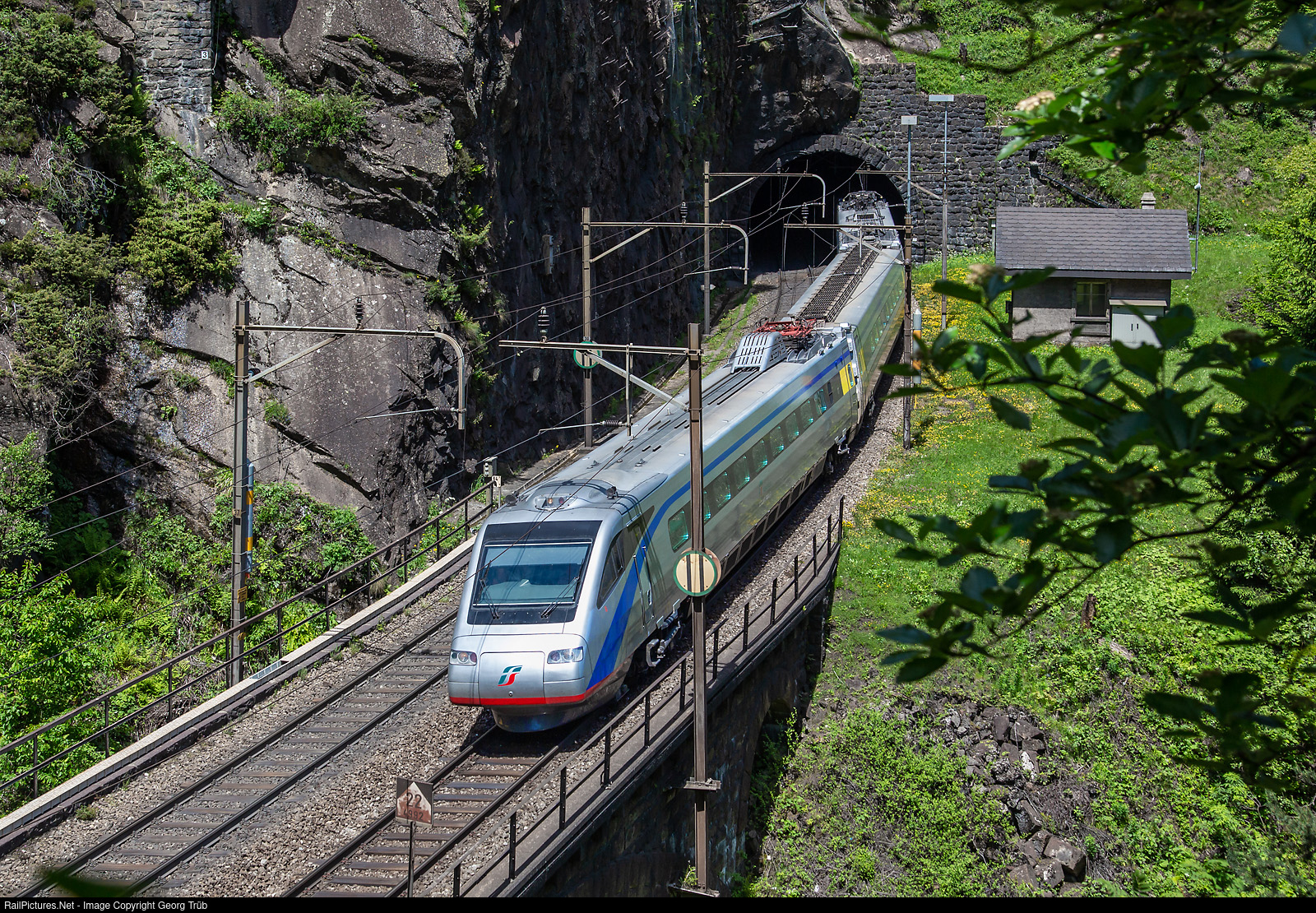 | Highspeed tilting train ETR 470 # 008 of Trenitalia is running the Eurocity 14 from Milan over the Gotthard mountain line to Zürich, between the Leggistein loop tunnel and the Strahlloch tunnel, near Wassen. |