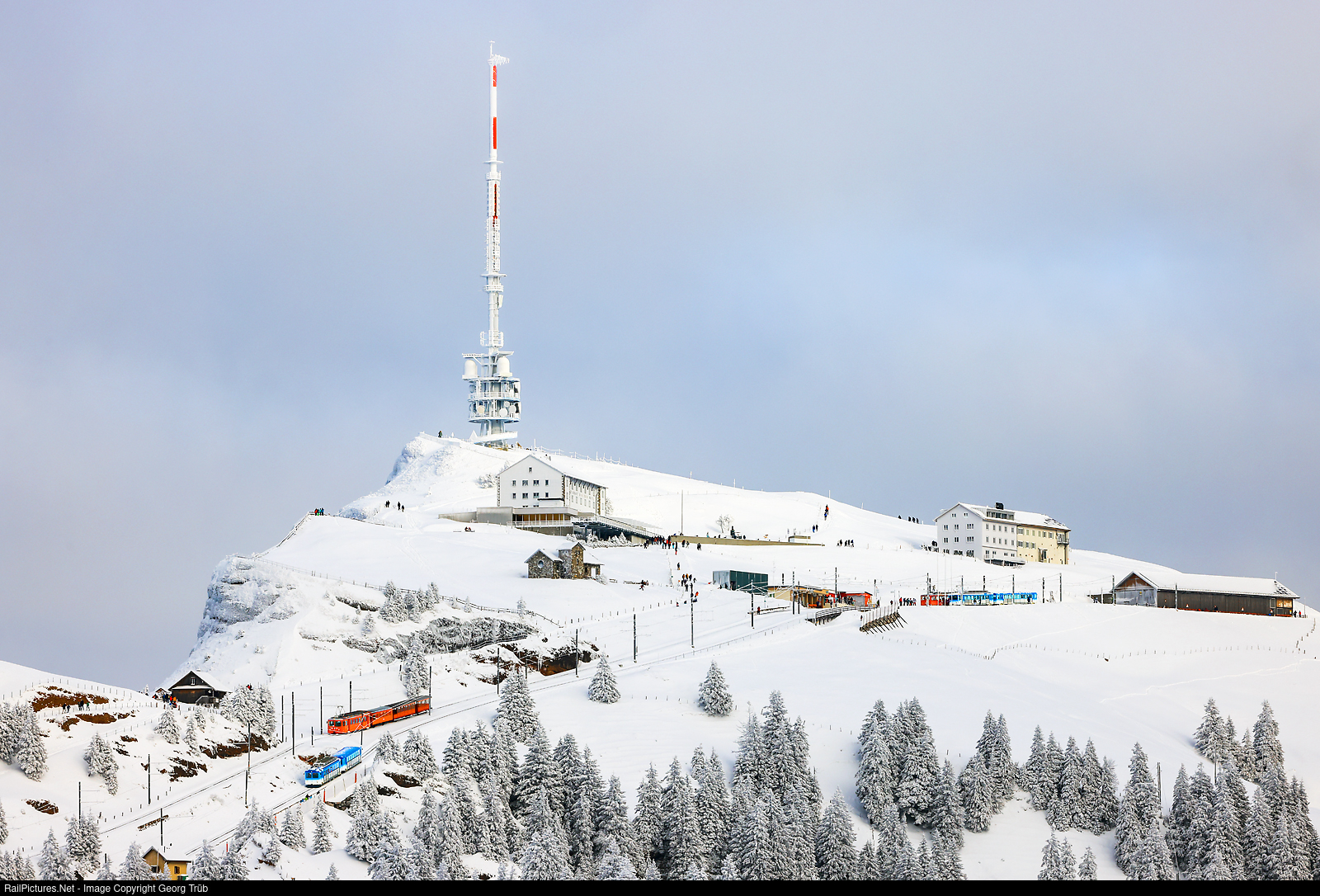 Top of the 1798 meter high Rigi mountain, called Rigi Kulm. A 96-meter-high, freestanding reinforced concrete tower built from 1995 to 1997 serves as the antenna support for the Rigi transmitter of Swisscom and has a publicly accessible visitor platform at a height of 6 meters. This broadcast tower replaced an older, 50-meter-high broadcast tower with a tube slot antenna (called the "Rigi Needle") built in 1964. Below the station you can see the red train 1128 running down to Vitznau, with railcar BDhe 4/4 # 5 and 3 cars. On the other track is train CC 144 for Arth Goldau with a blue push-pull train with a BDhe 2/4 of the series # 11 to # 14. In the station is the red railcar Bhe 2/4 # 1 and a blue train of the former Arth-Rigi-Bahn (ARB), which arrived some minutes ago from Arth Goldau. The view is from the top of 1659 meter high Rotstock.