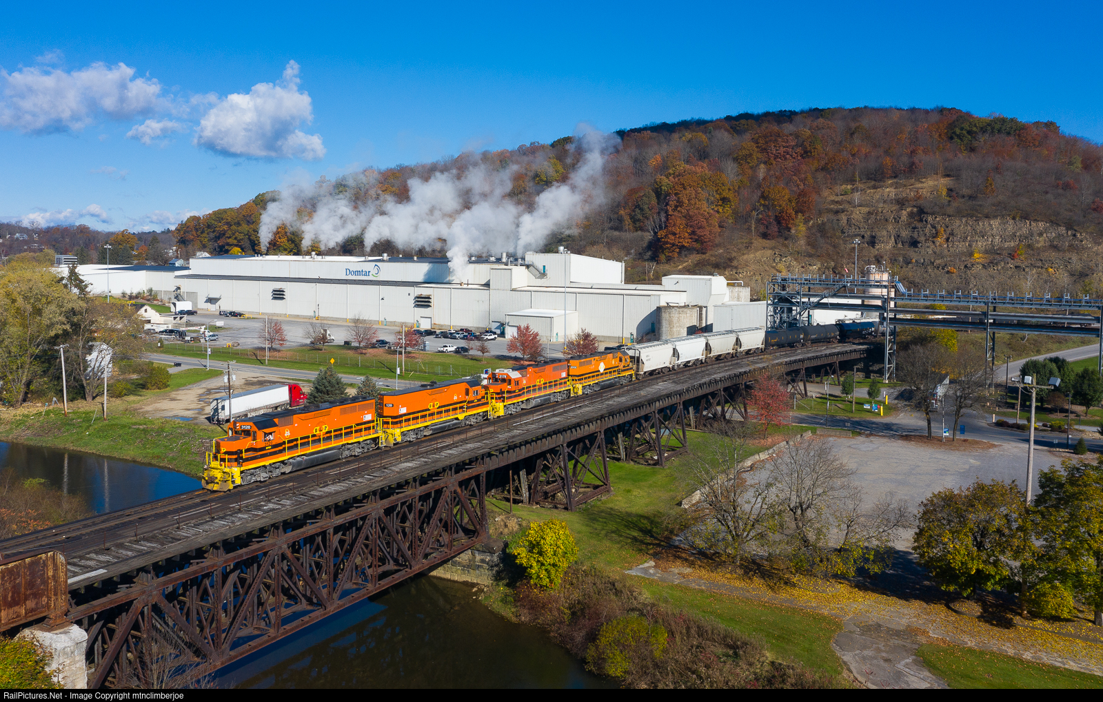 | A quartet of GP's power the Buffalo & Pittsburgh's WAJO as it rolls across the trestle over the Clarion River and A&E Sub as it heads south after working the yard in Johnsonburg, Pennsylvania in a rare daylight appearance. |