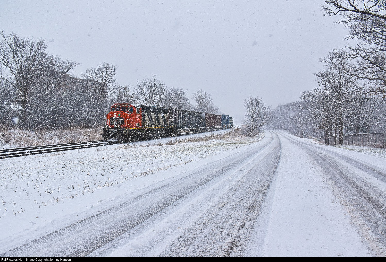 | The Chicagoland area missed a white Christmas by a few days, the area got a few inches 3 days later as Chicago Rail Link heads west around “Convent Curve” into Tinley Park during a heavy snowfall with a former CN GP40-2LW leading a push pull with OMLX 4200. |