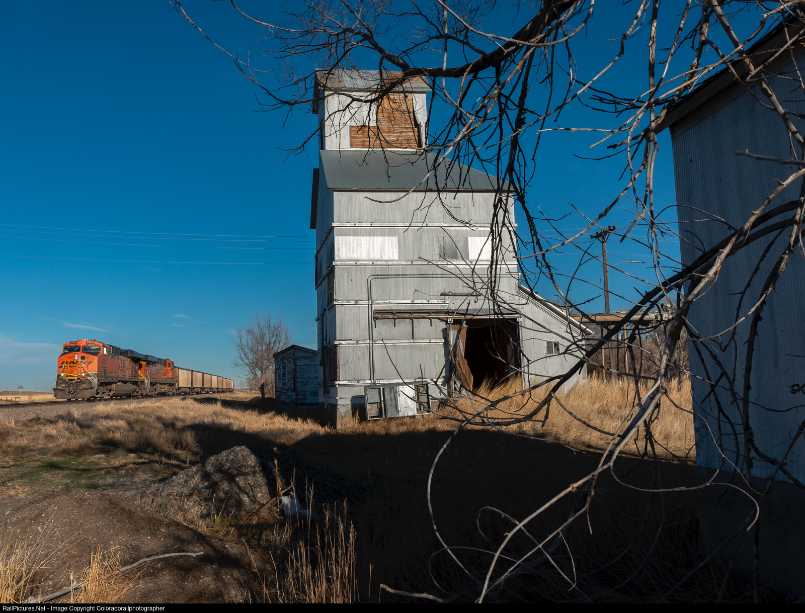 No longer a viable place for the busy agricultural market that was once a mainstay along the Union route at Merino stands this proud leftover from a bygone era. Not forgotten and still greets the trains as they whisk by. |