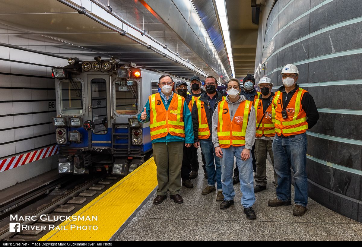 | Last Run. A happy retirement to MTA NYCT Subway's Antonio Cabrera (Assistant Chief Officer - Track Engineering, 37 plus years with the TA by his math) who performed his final inspection with TGC 4 (Track Geometry Car) on Wednesday, December 29, 2021. The group formed for a photo during an extremely rapid turn at the 96 Street-2nd Avenue Station. |