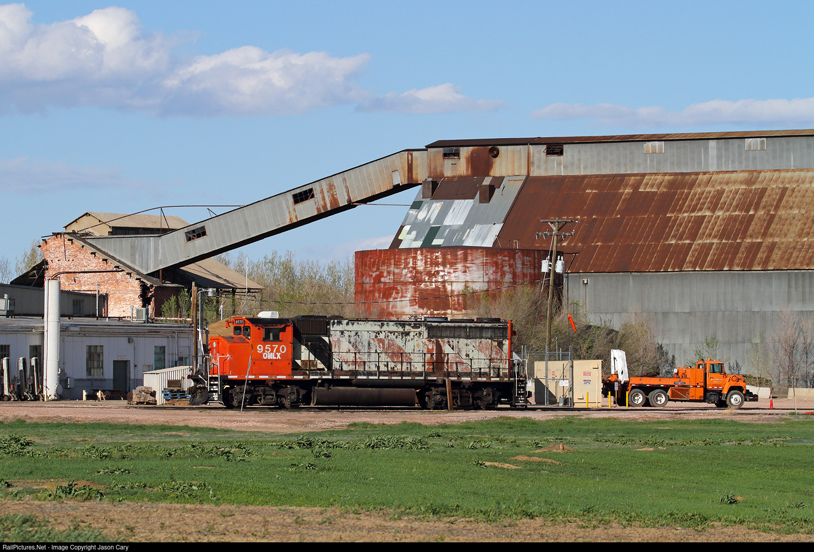 This is site of the former Great Western shops and rebuild center. Not much is done here anymore. Omnitrax's 's former Grest Western Railroad still offers a diverse and ever changing roster of locomotives. This former CN Wide Nose GP40-2 is no exception. Sitting next to the locomotive is a heavy GWR maintenance truck. |