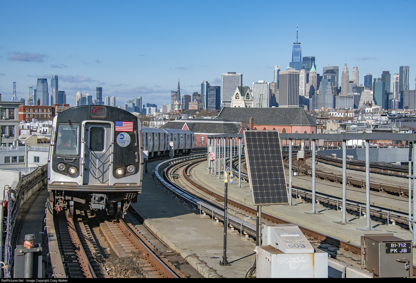 Perhaps the best view from the entire New York City subway system is at the elevated station at the Smith-9th Streets Station in Brooklyn, looking at lower Manhattan from across the East River. NYCT R160 car 9932 brings an outbound G Line train into the station, with the Freedom Tower (which replaced the destroyed World Trade Center's Twin-Towers) dominating the skyline (above and to the right of the solar panel). (Brooklyn, New York – December 26, 2021)
