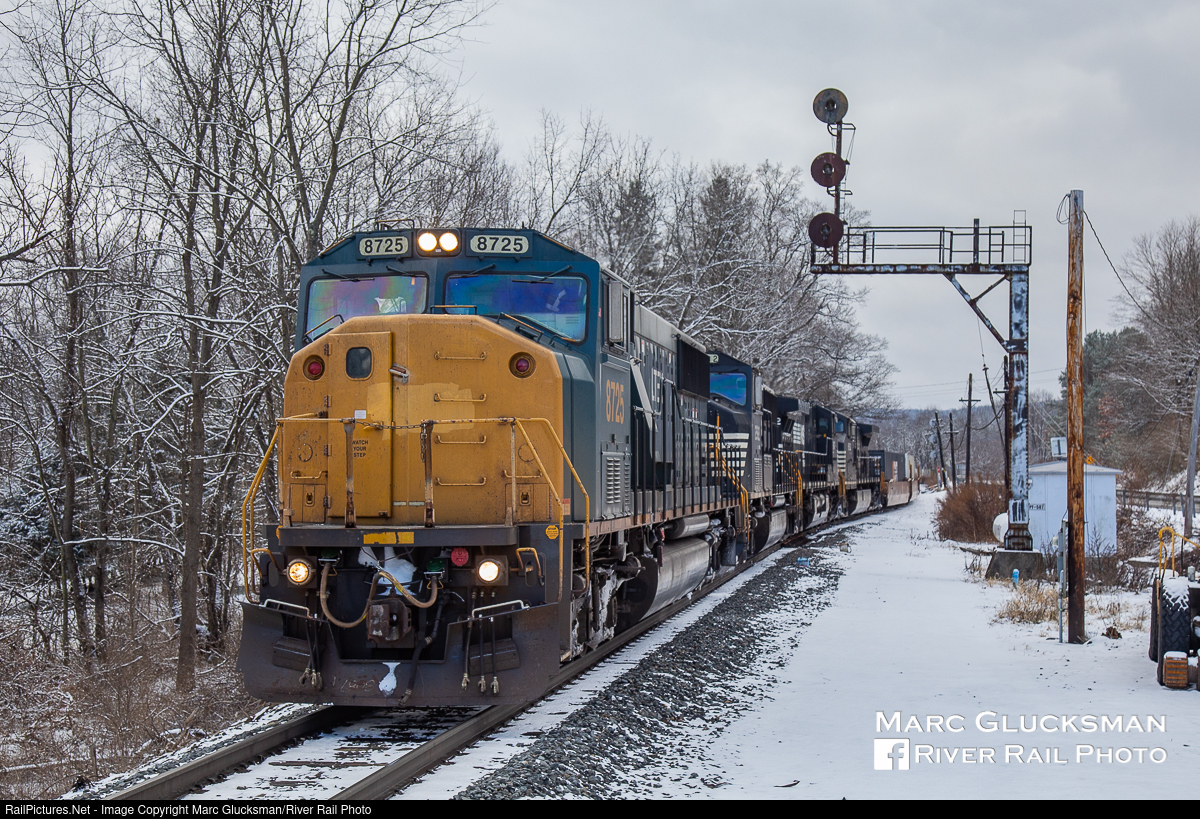 Norfolk Southern 22K with LTEX (former CSX) SD60I 8725 passes under the D&H searchlights at CPF-587 in Afton, NY on Sunday, December 30, 2018.