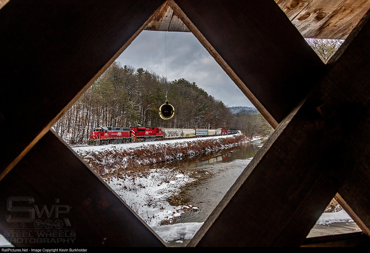 | The Vermont Rail System GMRC train 263 is seen along the Williams River at Bartonsville, Vermont, through the lattice work of the Bartonsville Covered Bridge. |