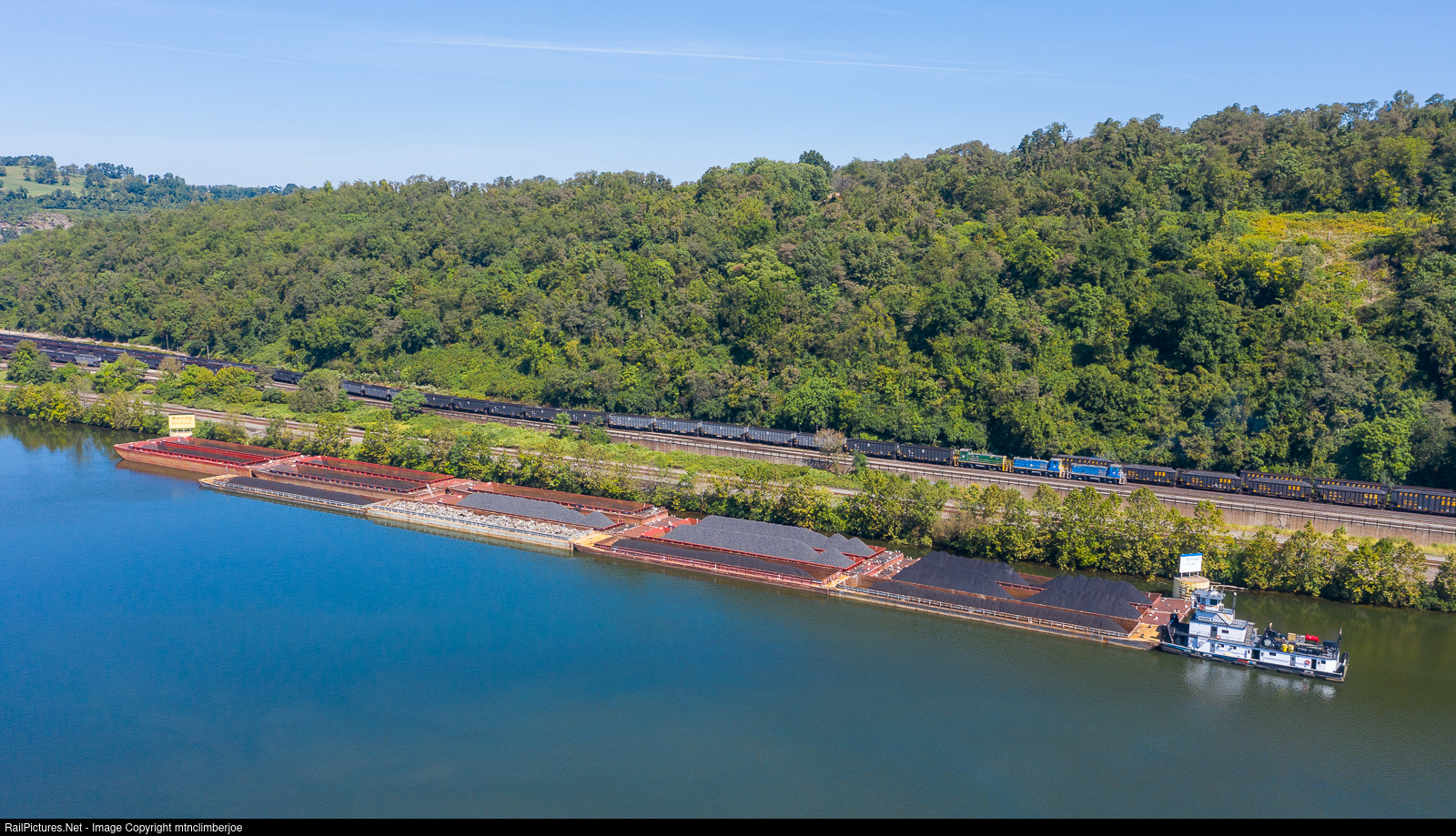 | A trio of MP15's on the Union Railroad's 66A job bring coke empties along the river as they pull out of the US Steel Edgar Thomson Works in North Versailles, Pennsylvania. A group of barges and the Marne B tug are moored in the Monongahela River waiting to proceed through the locks around the dam.