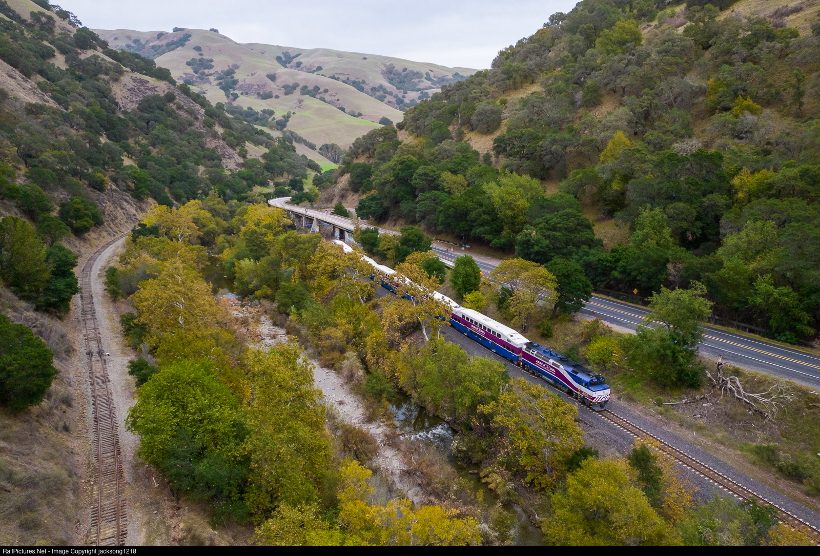 | Altamont Commuter Express train 06 makes its way eastbound through Niles Canyon with a F40PH for power. With ACE receiving 4 new Siemens chargers in the last year, the classic F40PHs have become a rarity on these trains. On the left of the frame is the Niles Canyon Railways track. |