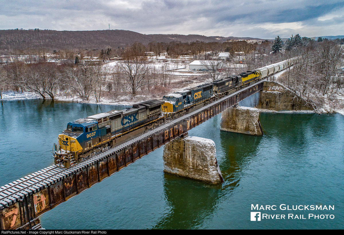Almost Home. Leased CSXT 9037 (C40-9W), CSXT 4589 (“Spirit Of Nashville”, SD70MAC), NS 6914 (SD60E), and NYSW’s own 3808 (SD60) have been recrewed for the remained for the trip to Binghamton, New York after spending the night in Chenango Forks on Sunday, December 30, 2018. The train is seen crossing the Chenango River, Port Crane, New York. The New York, Susquehanna, and Western Railway leased a number of unusual engines that season to help it through a time when it was short of power.