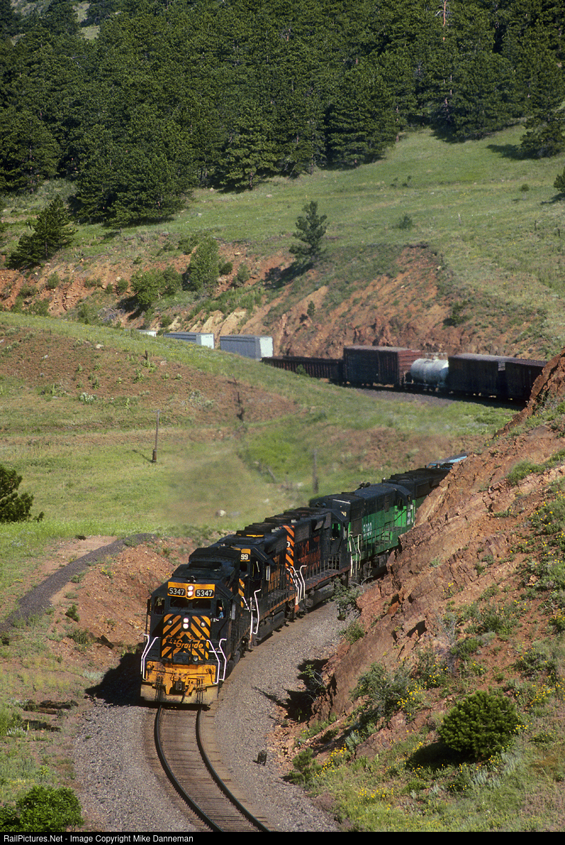 Rio Grande train 187, off the Burlington Northern in Denver, has a couple of Cascade green machines in the consist on the morning of July 8, 1989, as the westbound freight climbs toward Tunnel 1 approaching Plainview, Colorado, on the Moffat Tunnel Route.