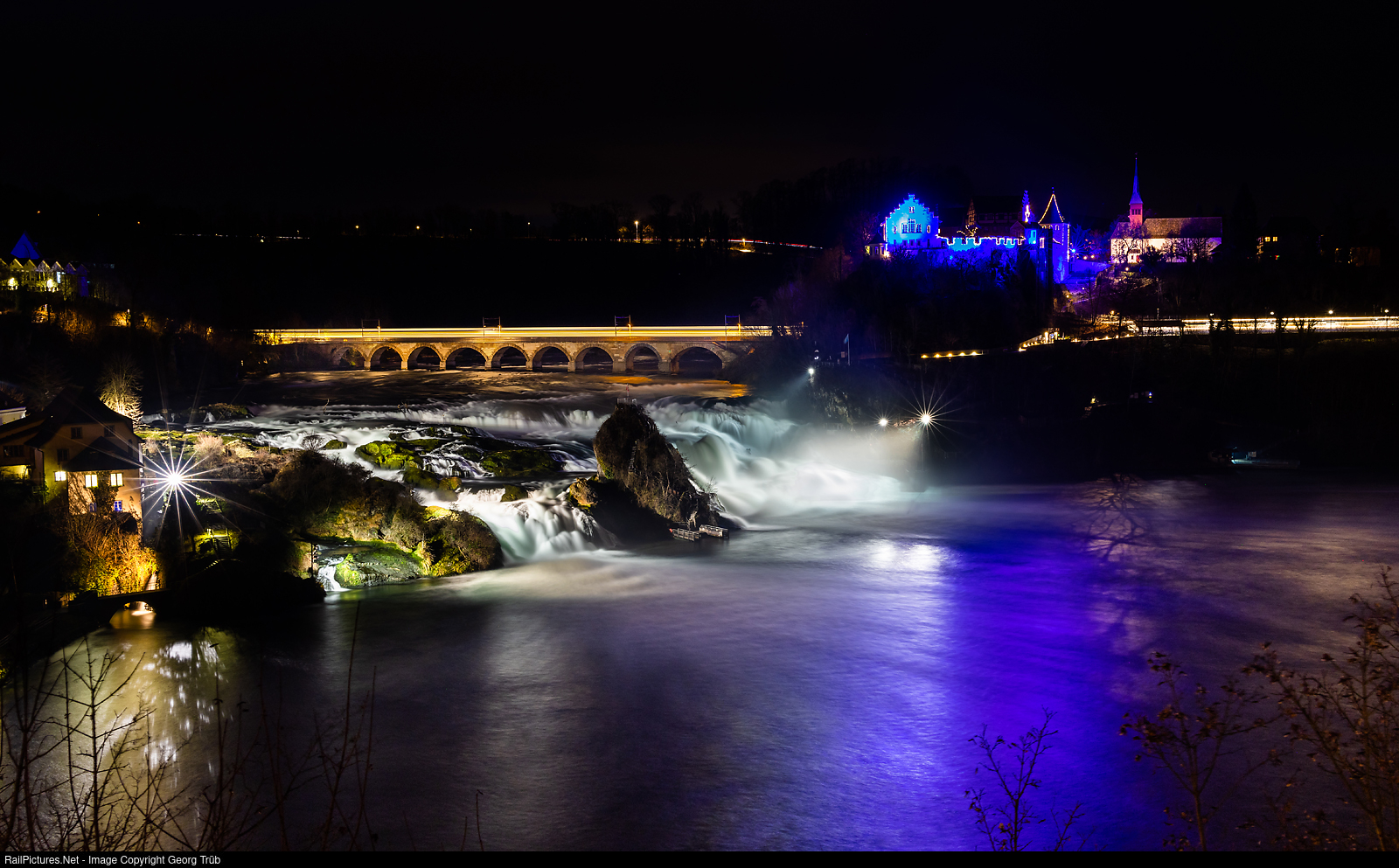 Doubledeck commuter train DPZ+ of the SBB, running as S 12 service 19270 from Schaffhausen via Winterthur-Zürich to Brugg AG, is crossing the 177 meter long bridge over the Rheinfall, built in 1856, between Neuhausen (left) and the stop of Schloss Laufen am Rheinfall (right, below the church). In this moment, about 400 m3 of water are falling down in a second (105'000 gallons per second). The blue illuminated Laufen castle was mentioned for the first time in 858. On the right is the several hundred years old reformed church of Laufen am Rheinfall, which has been rebuilt and extended several times, its present form dates largely from 1948, 2001 was the last renovation.