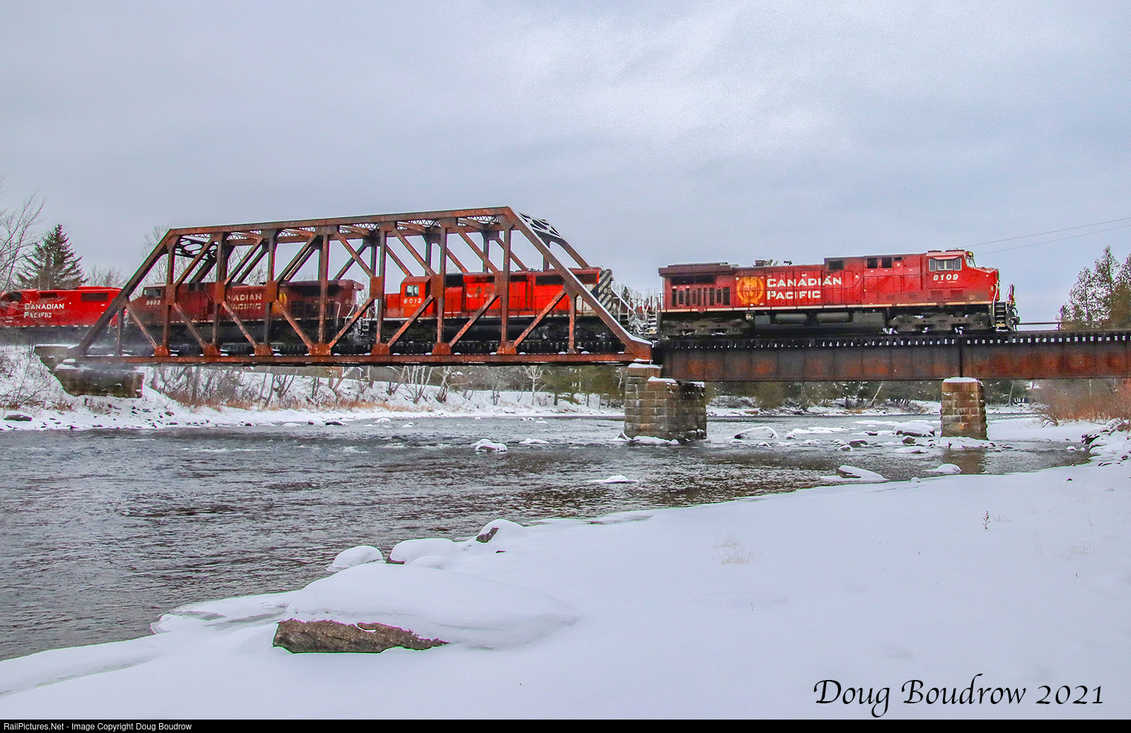 | Canadian Pacific train 142 is seen crossing the East Outlet of Moosehead Lake on a dreary late December afternoon. The Quebec to Brownville Junction mixed freight made a stop in Jackman to change Canadian to American crews and also to swap out some international containers before proceeding East. |