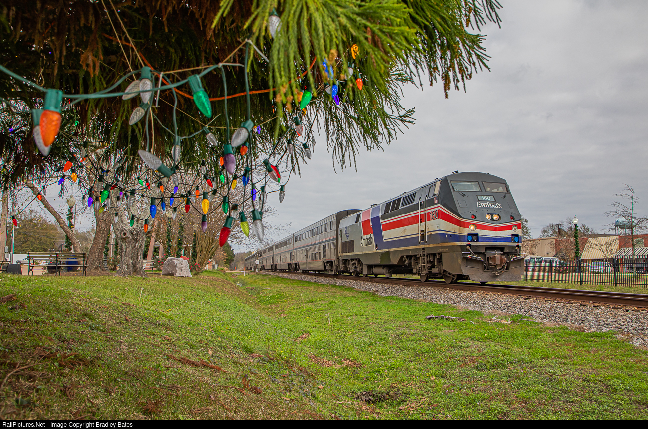Amtrak's “City Of New Orleans” Train #59 roars south through Crystal Springs, MS., with Amtrak #160 leading the way wearing it's heritage "Pepsi can" paint scheme which Amtrak painted up for their 50th anniversary