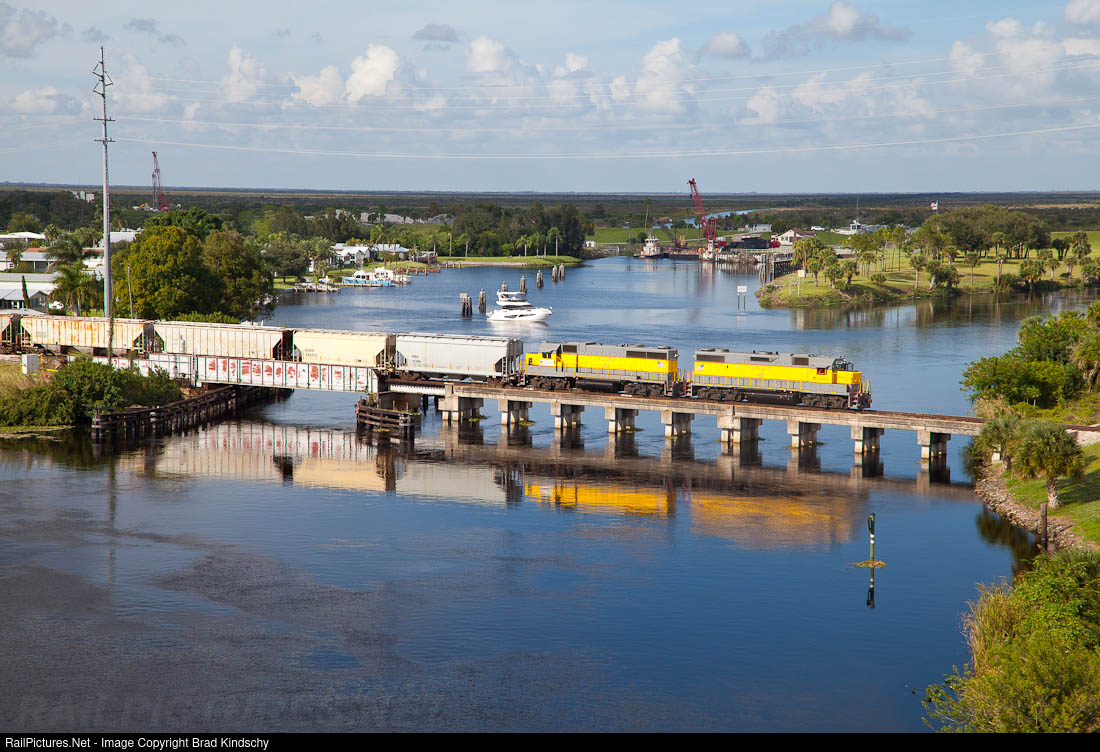 The pair of GP38's sounded good after stopping to close the bridge over the Caloosahatchee Canal. The 10 car train momentarily delays a small yacht coming off Lake Okeechobee in the background.