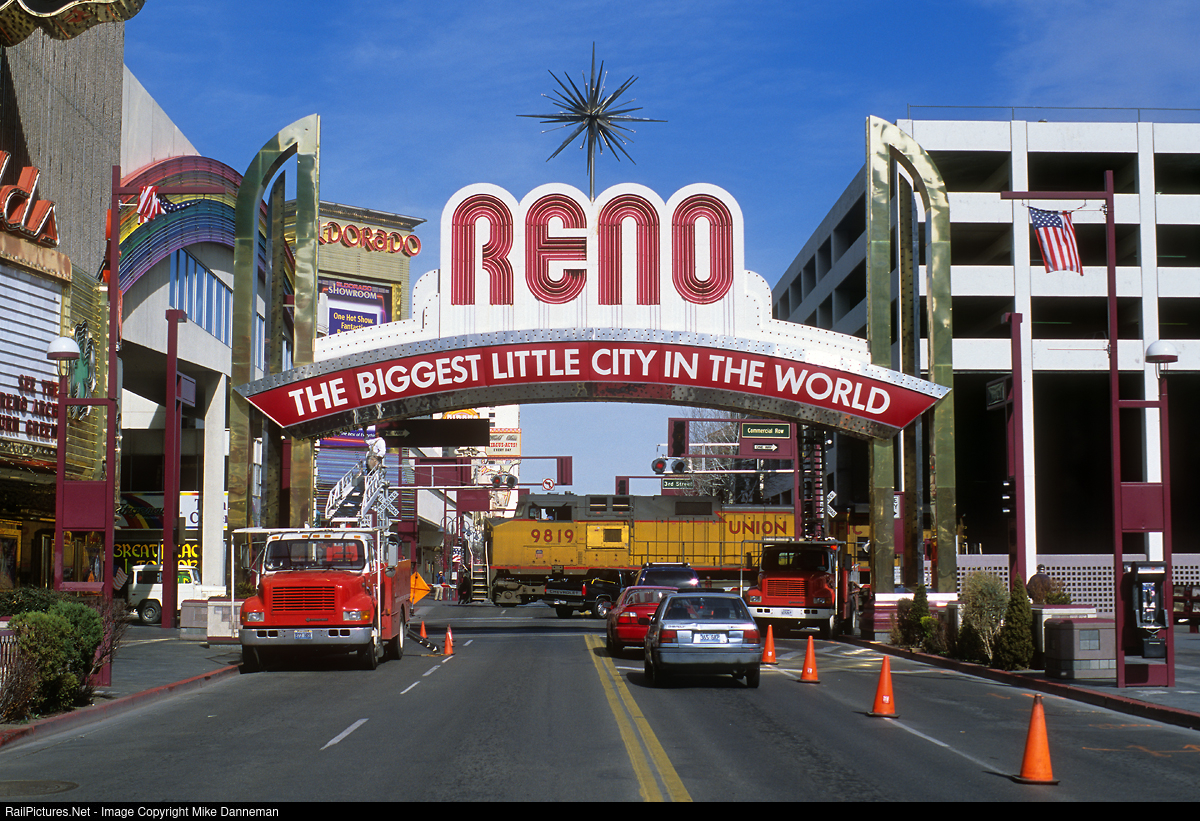Traffic is a bit jammed up on Virginia Street grade crossing beneath the famous Reno Arch in Reno, Nevada, as a westbound Union Pacific train rumbles through on March 11, 2003. Not helping the situation are two city trucks and crew that happened to be changing light bulbs from clear to green on the famous sign for St. Patrick’s Day 2003. The following year, construction began on the “Reno Trench,” that would soon thereafter take trains below street level.