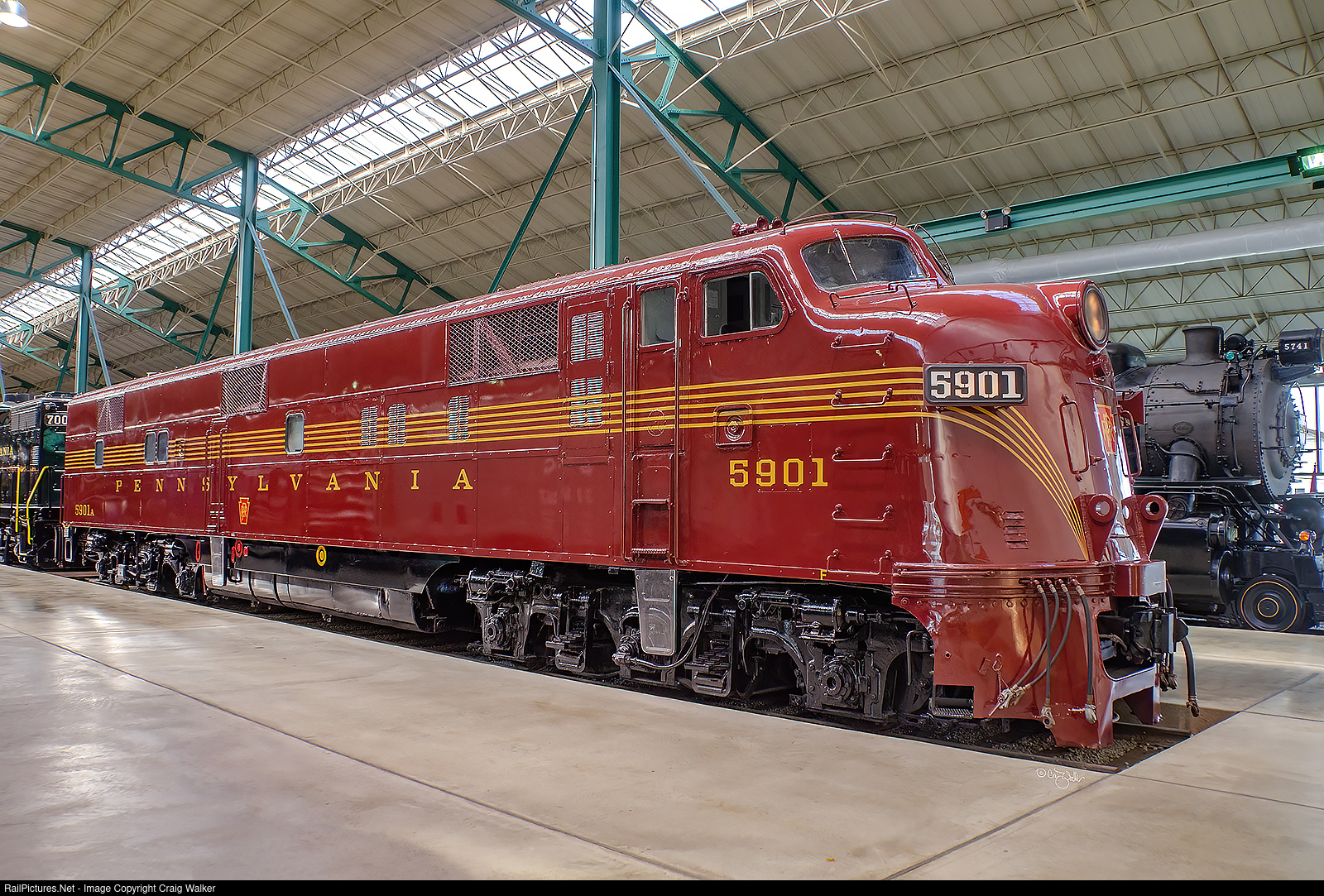 The Railroad Museum of Pennsylvania owns the last extant EMD E7, in the form of Pennsylvania Railroad E7A 5901. This engine, built by General Motors Electro-Motive Division in September 1945, was assigned to the Pennsy's passenger trains. This beautifully preserved engine wears its original number, PRR 5901, but it was renumbered to PRR 4201, and then Penn Central 4201 following the Pennsylvania's merger with the New York Central in 1967. The engine has been restored to its appearance after the PRR added their distinctive numberboards, added lift lugs and an MU receptacle to the nose, modified the vents and portholes on the sides and added a number of grabirons. The engine is painted in the original Tuscan Red with five-pinstripes. The PSRM is full of nicely restored railroad equipment that is nicely displayed, and is well worth a visit when in central Pennsylvania. (Strasburg, Pennsylvania – September 28, 2013)