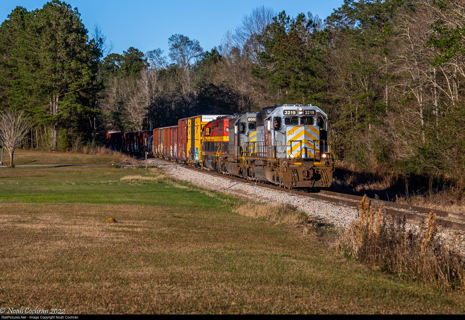 KCS Job 16 hauls south down the Gulfport Subdivision behind a trio of KCS SD40-2s, the lead two being the last two active that still wear the Gray Ghost scheme. In perfect light, we see them entering the small community of Brooklyn, MS, about a third of the way to Gulfport on their return trip.