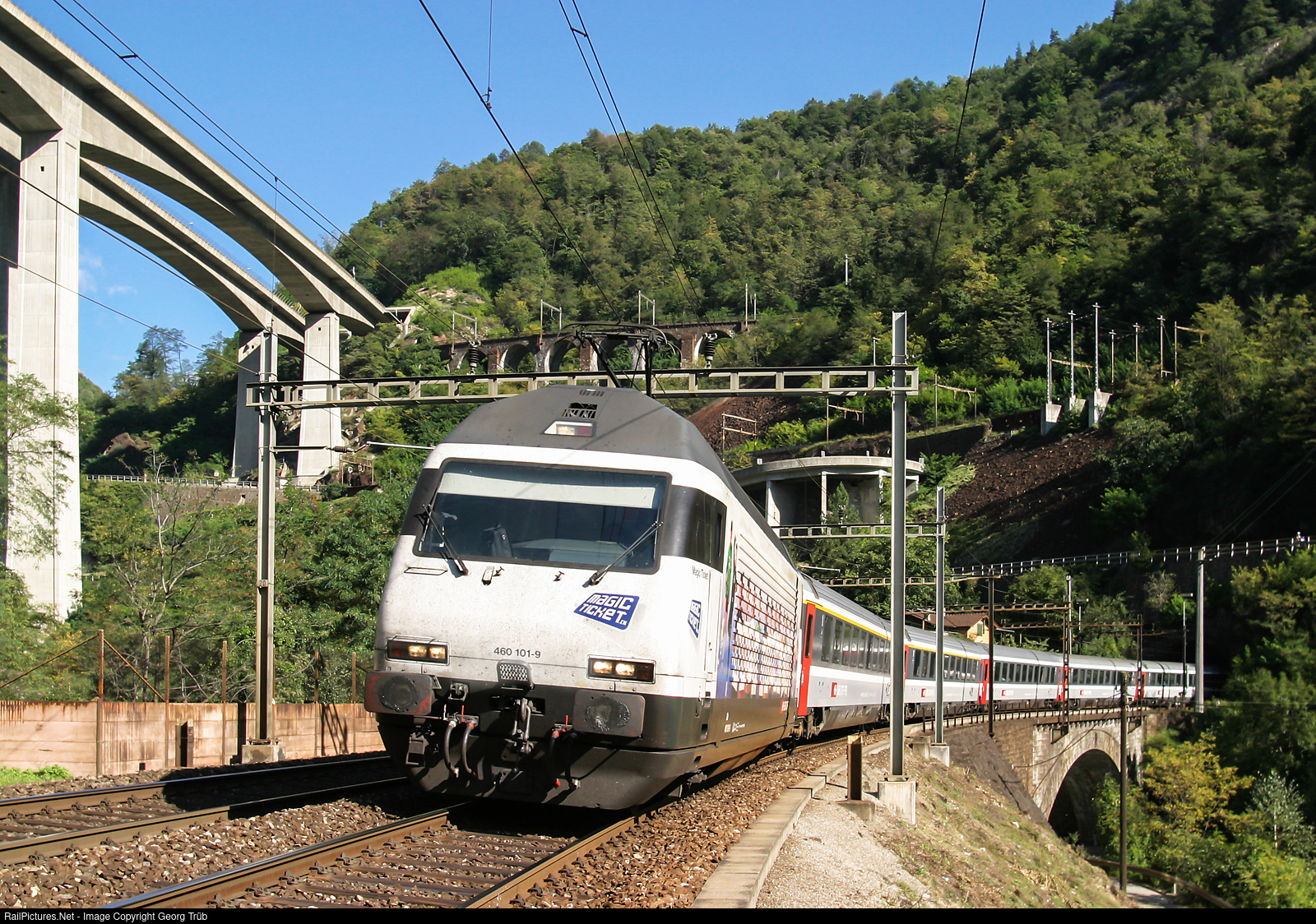 | Re 460 # 101 in the "Magic Ticket" publicity paint scheme is pulling the Eurocity Cisalpino 109 from Basel via Lucerne to Milan on the Gotthard south ramp in the Biascina between Lavorgo and Giornico. |