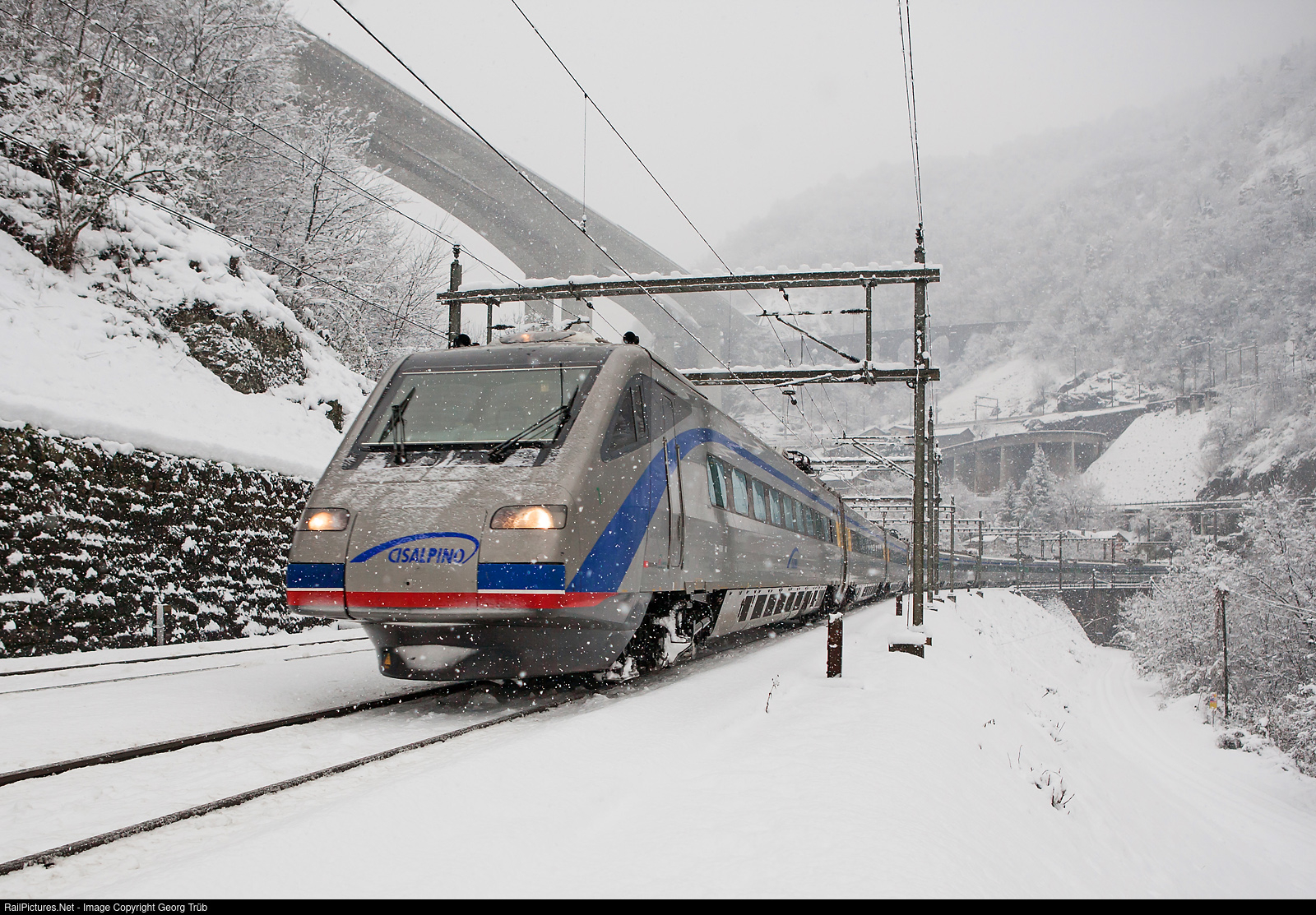 | After train CIS 153 was stranded in Lavorgo (unfortunately not uncommon), the higspeed tilting train ETR 470 # 001 of the Cisalpino is now heading as empty extra southbound through the three levels of the Biaschina. |