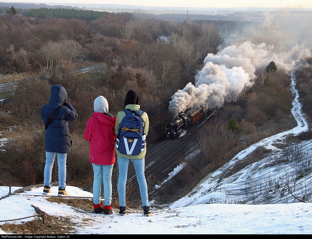 | Young railfans (also railroaders of the MÁV Children's Railway, Budapest) take pictures of a special train on a cold and windy day in December. |