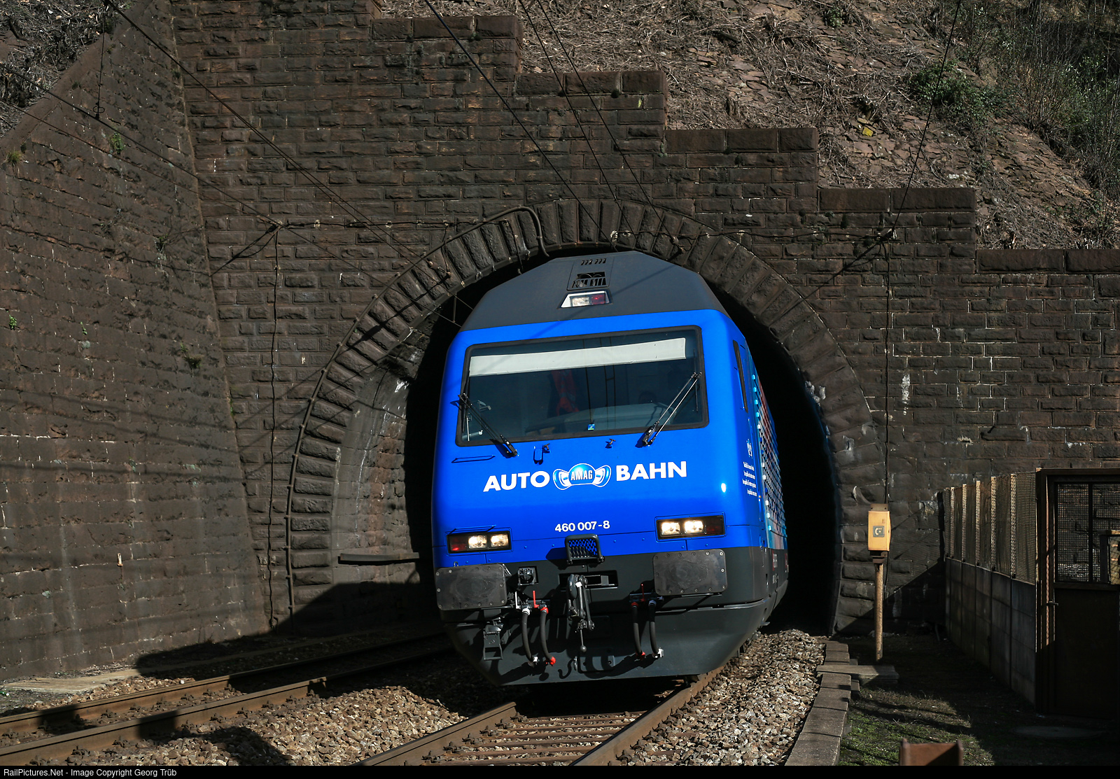 | Re 460 # 007 of the SBB in the publicity paint scheme for the AMAG (AMAG Automobil und Motoren AG, large swiss car retailer) is leaving the Pianotondo spiral tunnel in the Biaschina with the Eurocity 172 CISALPINO INSUBRIA from Milan over the Gotthard mountain line to Zürich. |