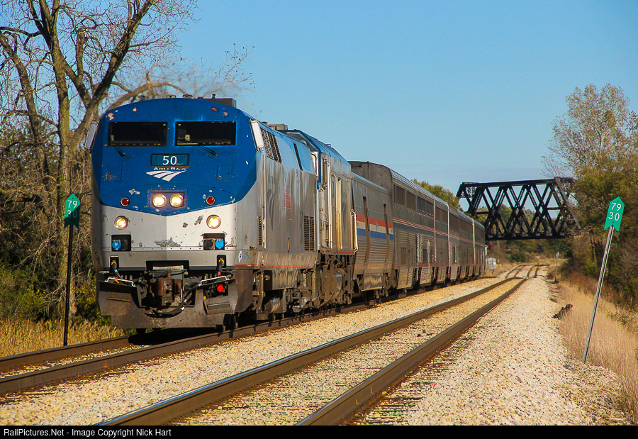 | With the diamonds at CP Canal (CN-IHB crossing) being replaced, Amtrak's Texas Eagle #21 out of Chicago was detoured down Metra's Rock Island District. It's seen making its way west through New Lenox with the old Wabash bridge (Metra's Southwest District) in the distance. |