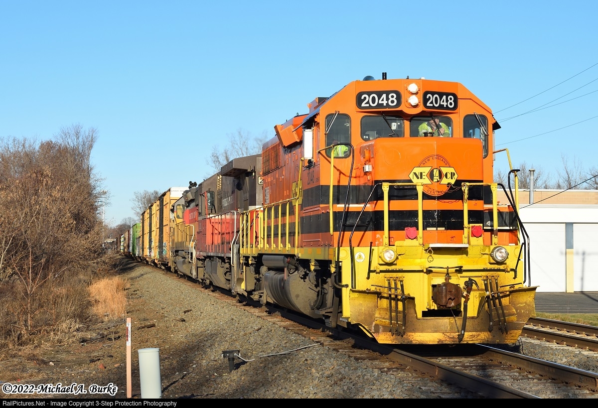 Catching the early afternoon sunlight in Windsor is Connecticut Southern CSO-4, which is returning to Hartford after picking up its cars from CSX in West Springfield, MA. The power for this day's train consisted of New England Central GP38-2 2048, Providence & Worcester B23-7R 2215, and Connecticut Southern SD40-2 3771.